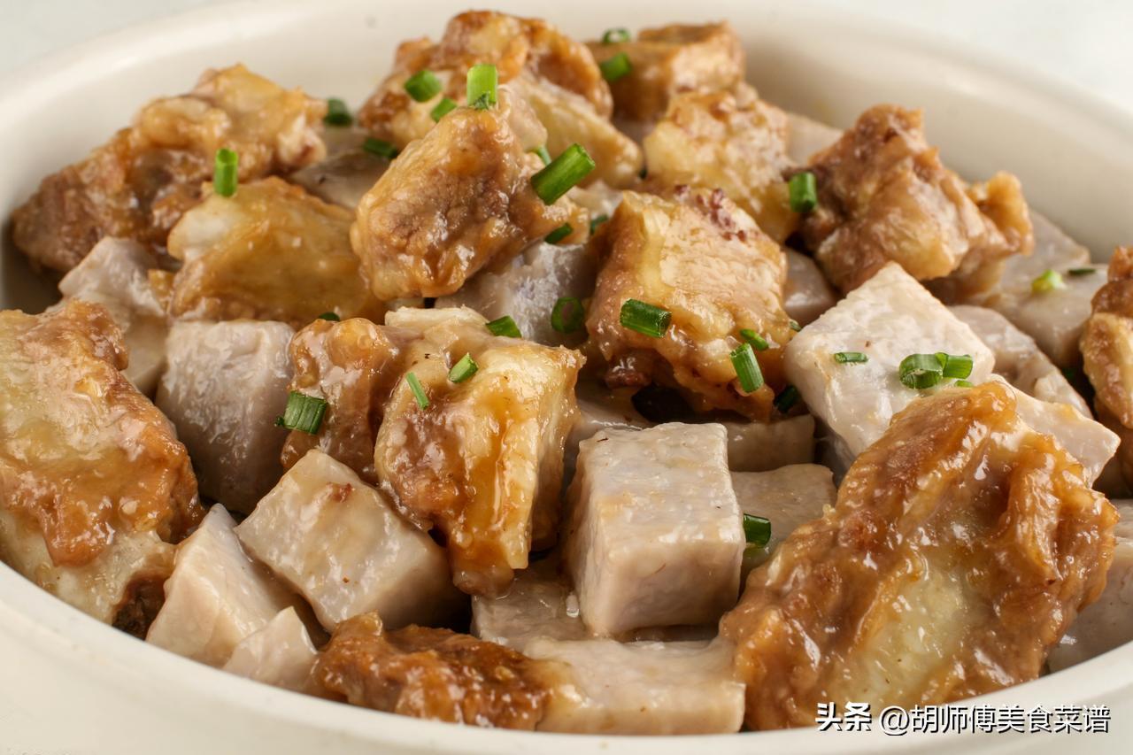 【食材準備】:芋頭500克、排骨500克、生抽、雞精、薑末、胡椒粉、十三香、排骨醬、米粉、食用油、蔥花適量。
