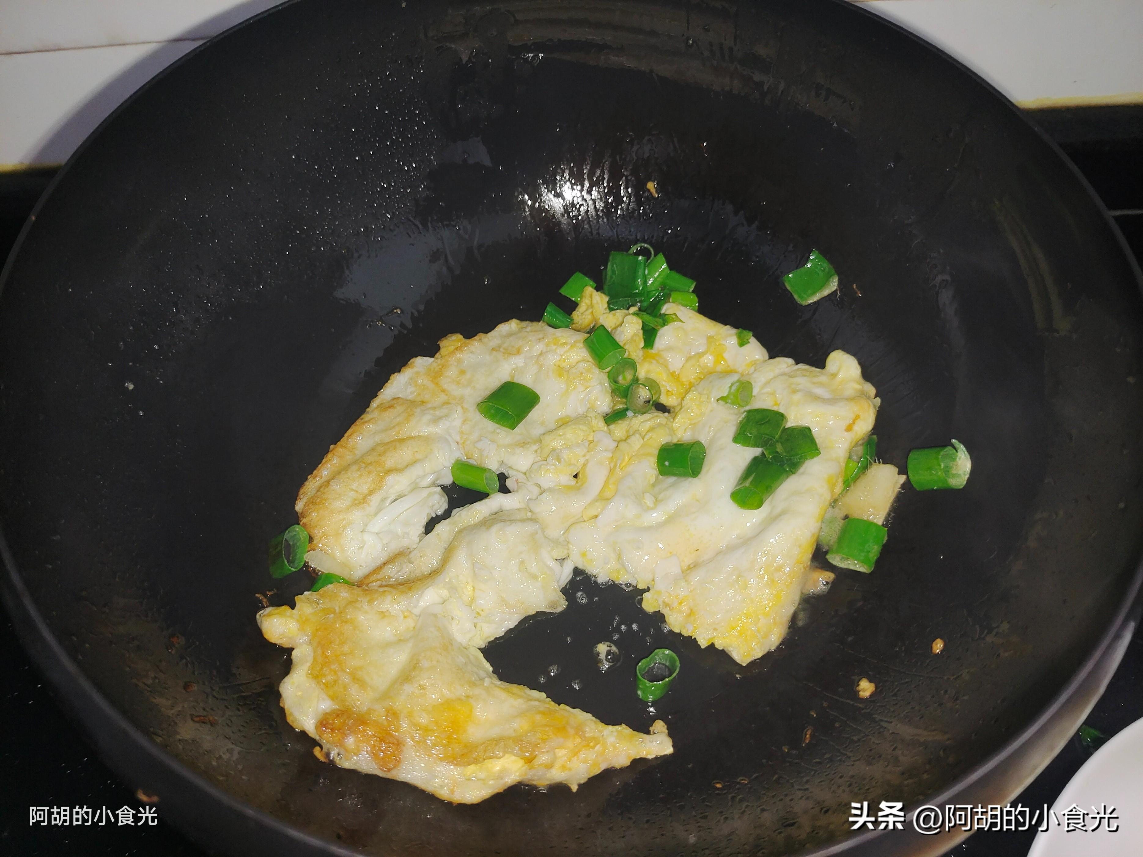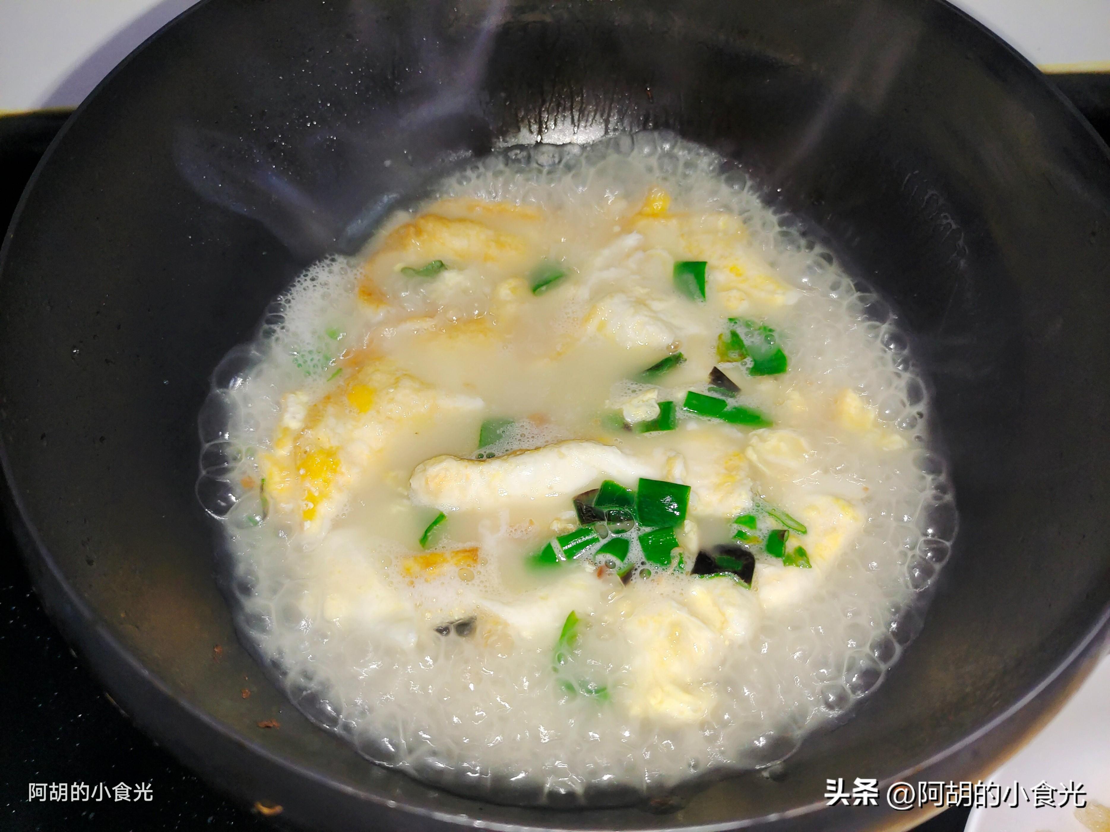 第三步:基本主要食材都備好就可以開火烹飪。先把鍋烘乾,淋入一些菜籽油後燒熱,而後直接打入兩個雞蛋液煎炒至凝固,撒入蔥姜炒出香味,再直接衝入開水適量,轉爲最大火煮一煮讓湯汁泛白。