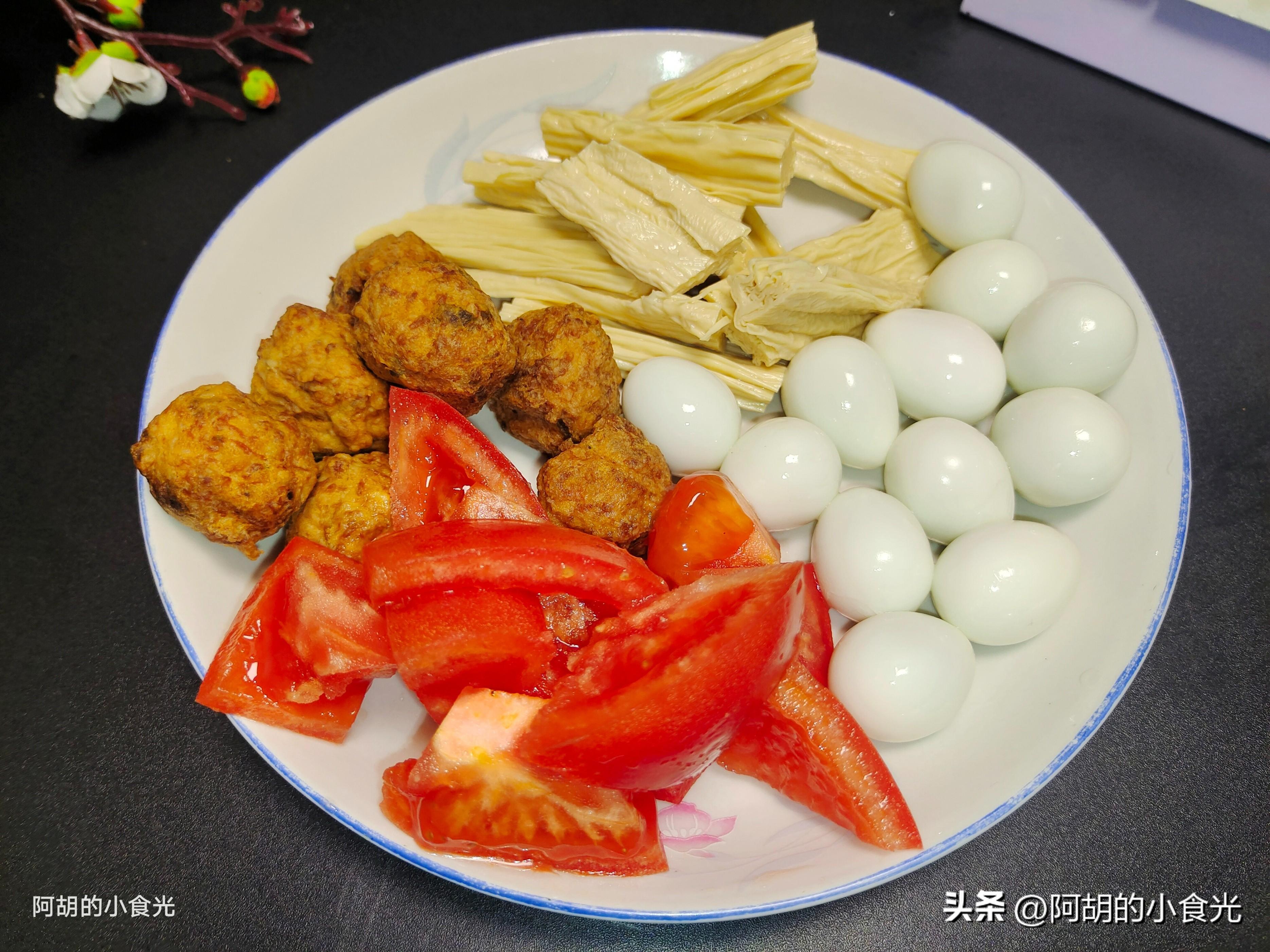 第二步:其它的食材有煮熟的鵪鶉蛋十幾個去殼,油炸的肉丸子七八個左右,你也可以用水汆豬肉丸或者牛肉丸代替。再來一個西紅柿切塊,泡軟的腐竹適量,一棵青菜洗淨待用。