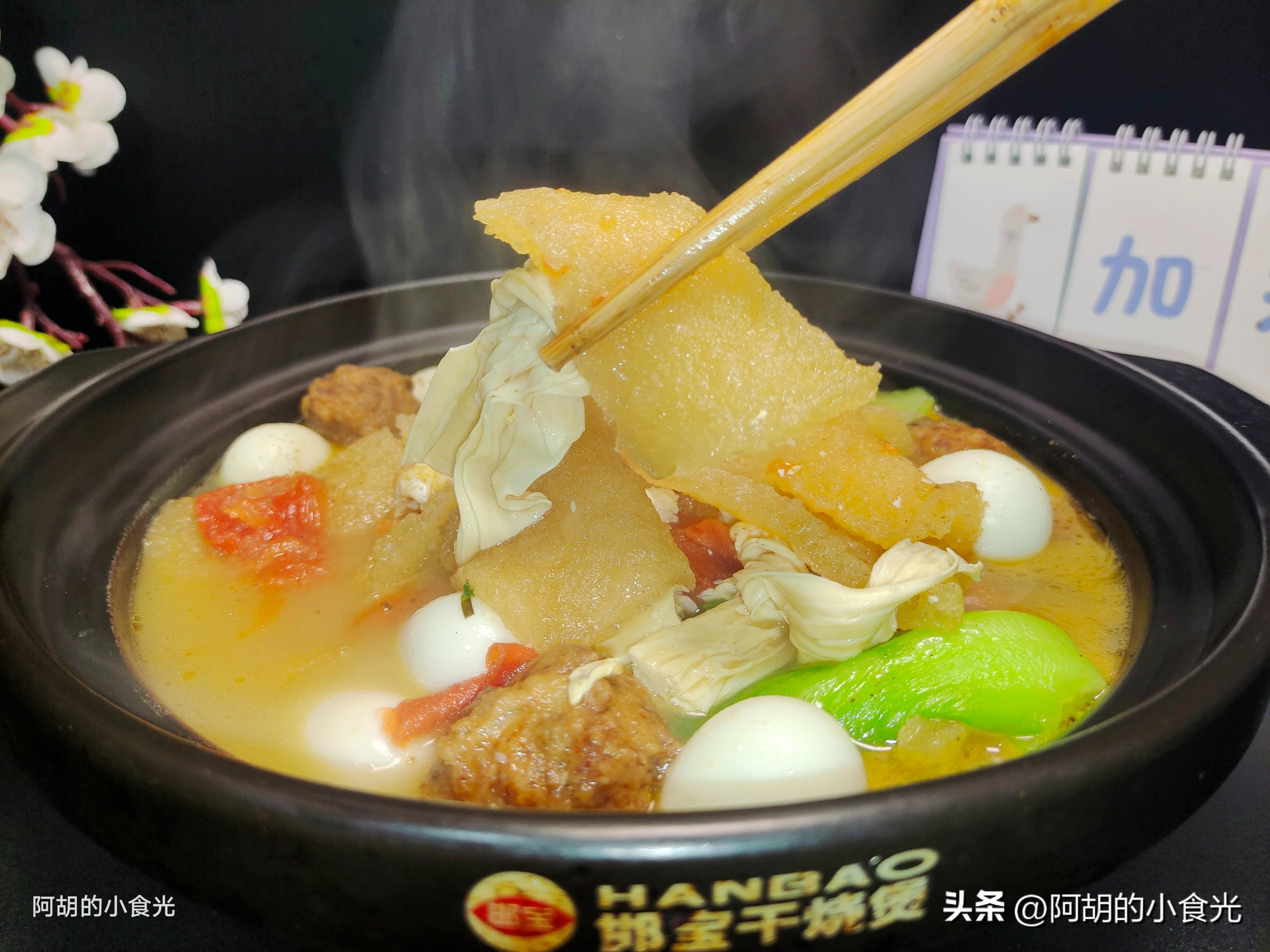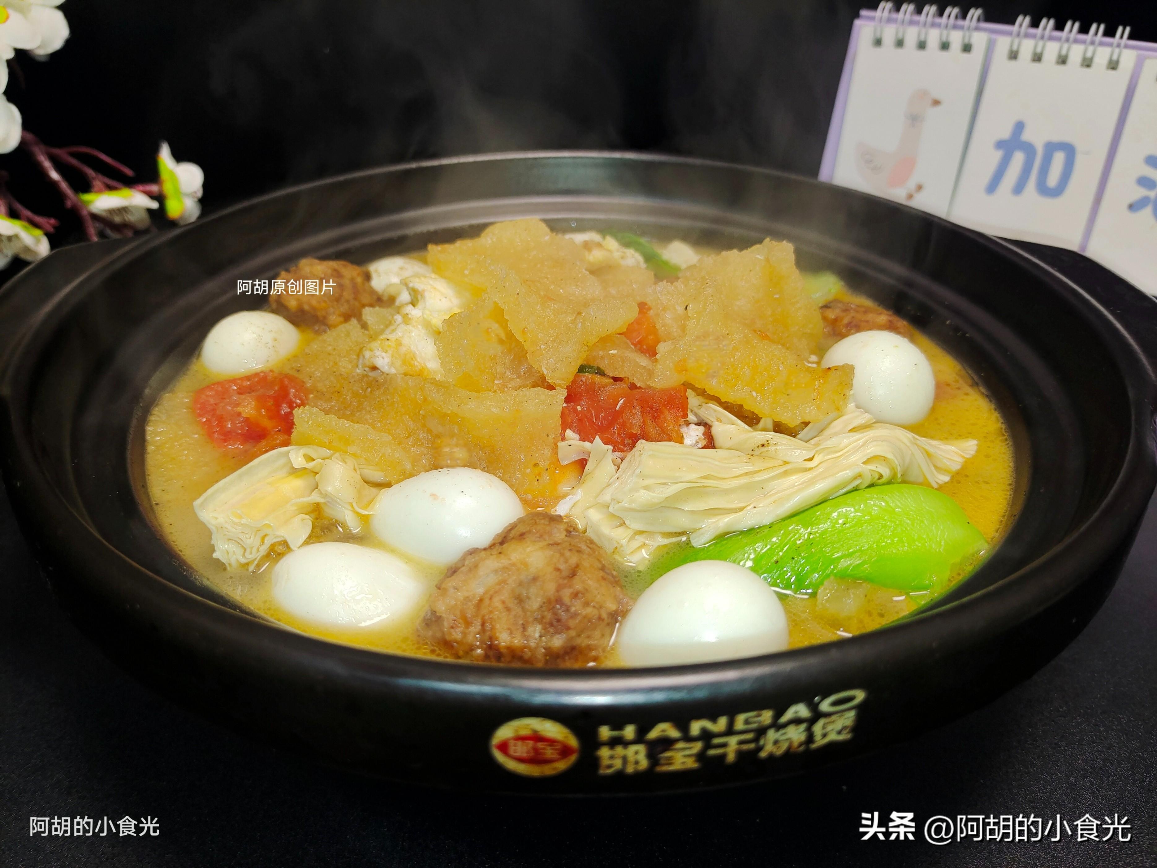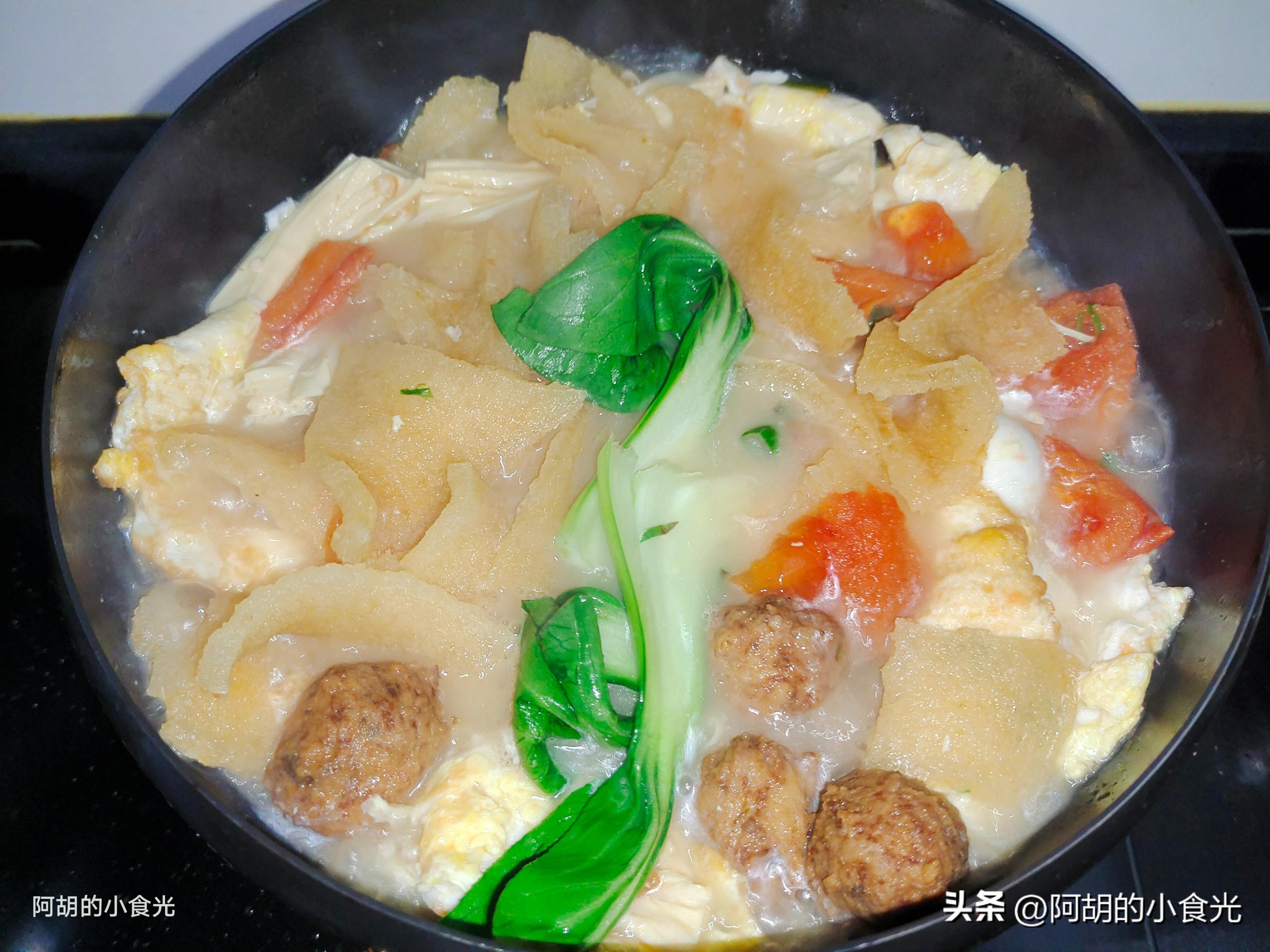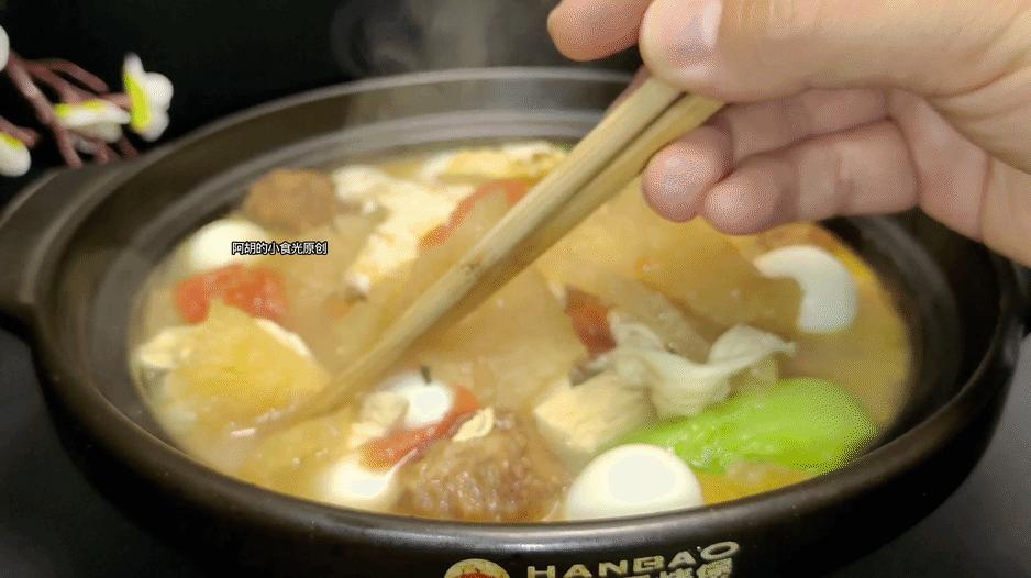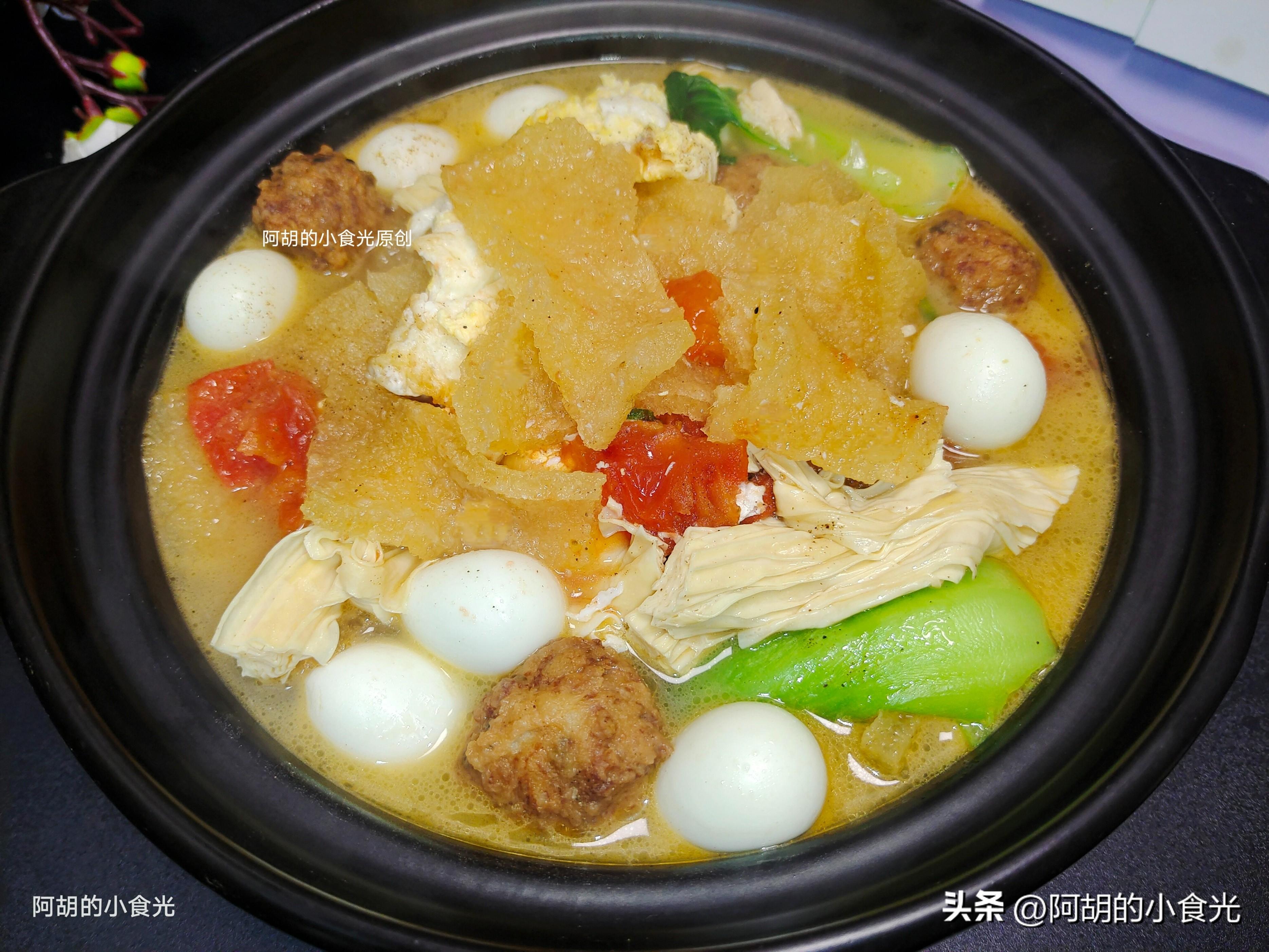 食材有皮肚、鵪鶉蛋、肉丸子、西紅柿、青菜、雞蛋和腐竹,菜肉蛋豆製品都是集齊了,喫前先來一口湯,酸酸的一口就打開好胃口,尤其是皮肚這個食材,吸收了湯汁的味道軟軟嫩嫩又下飯,簡單好做全家都喜歡。