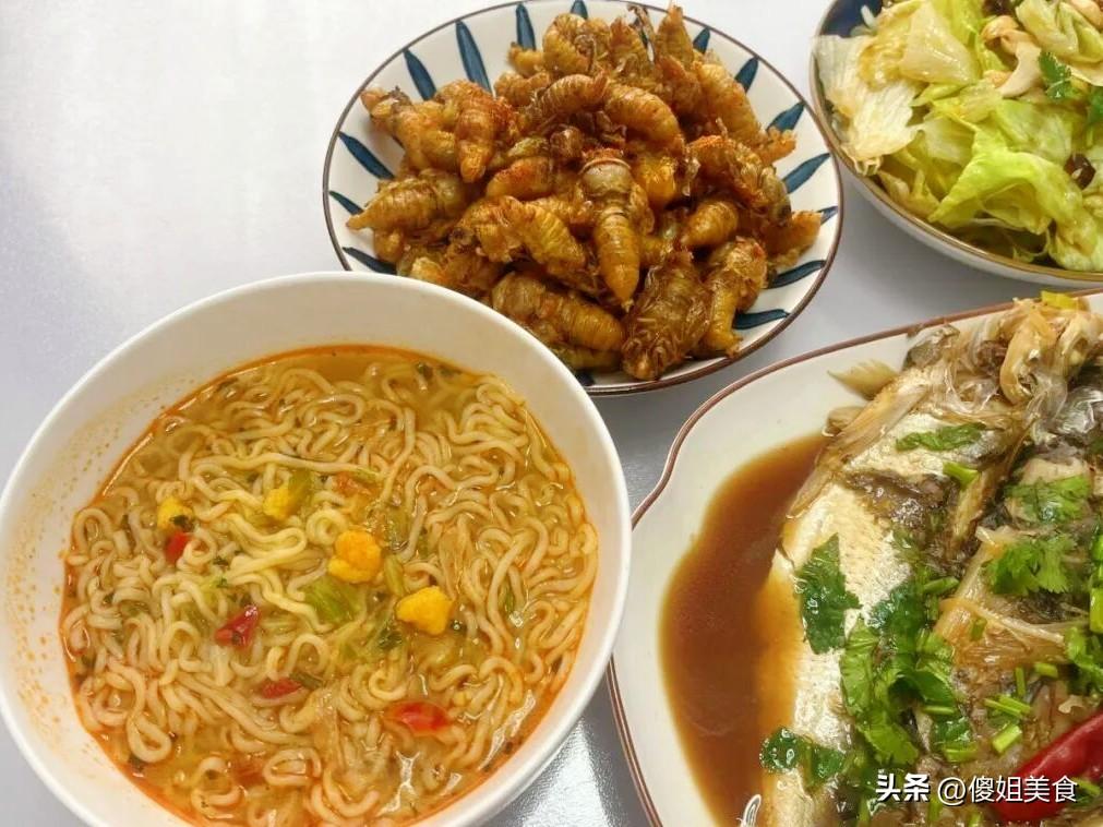 魚湯的鮮美還在脣齒間,炸金蟬的酥香回味無窮,爽口的生菜清理了味蕾,這時候來上一口熱騰騰、滑溜溜的方便麪,那種滿足感,真是山珍海味都比不了。