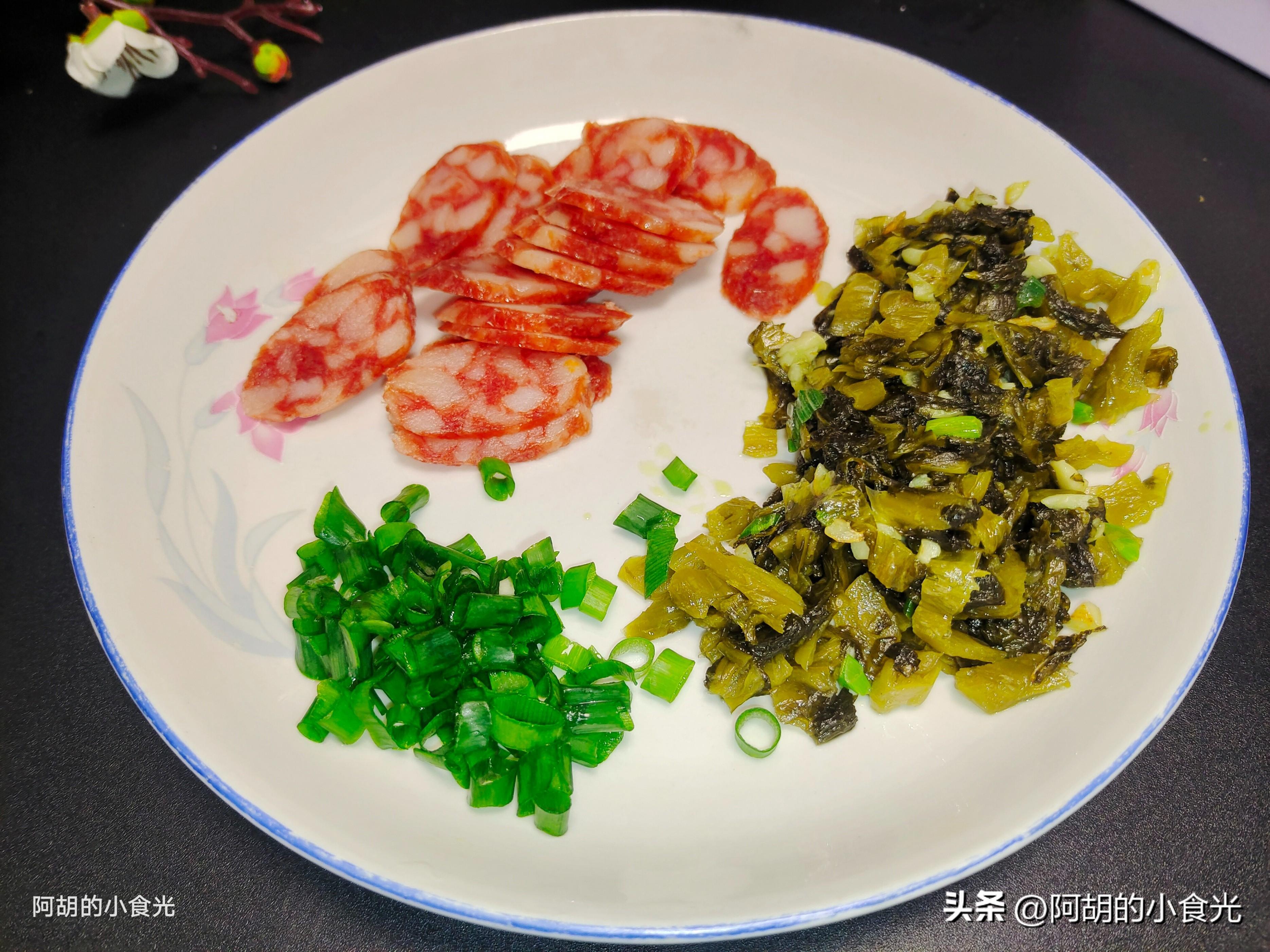 第二步:準備的主要配菜有廣式臘腸一小節,清洗乾淨後直接切成薄片待用,你也可以根據自己的喜好選擇其它口味的臘腸,如原味的、五香的或者麻辣的都可以。再來一小塊酸菜備用,這個酸菜是我提前用蔥薑蒜和食用油炒過的,再來一些蔥花備用。