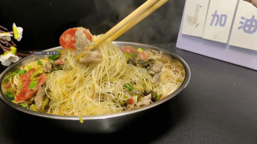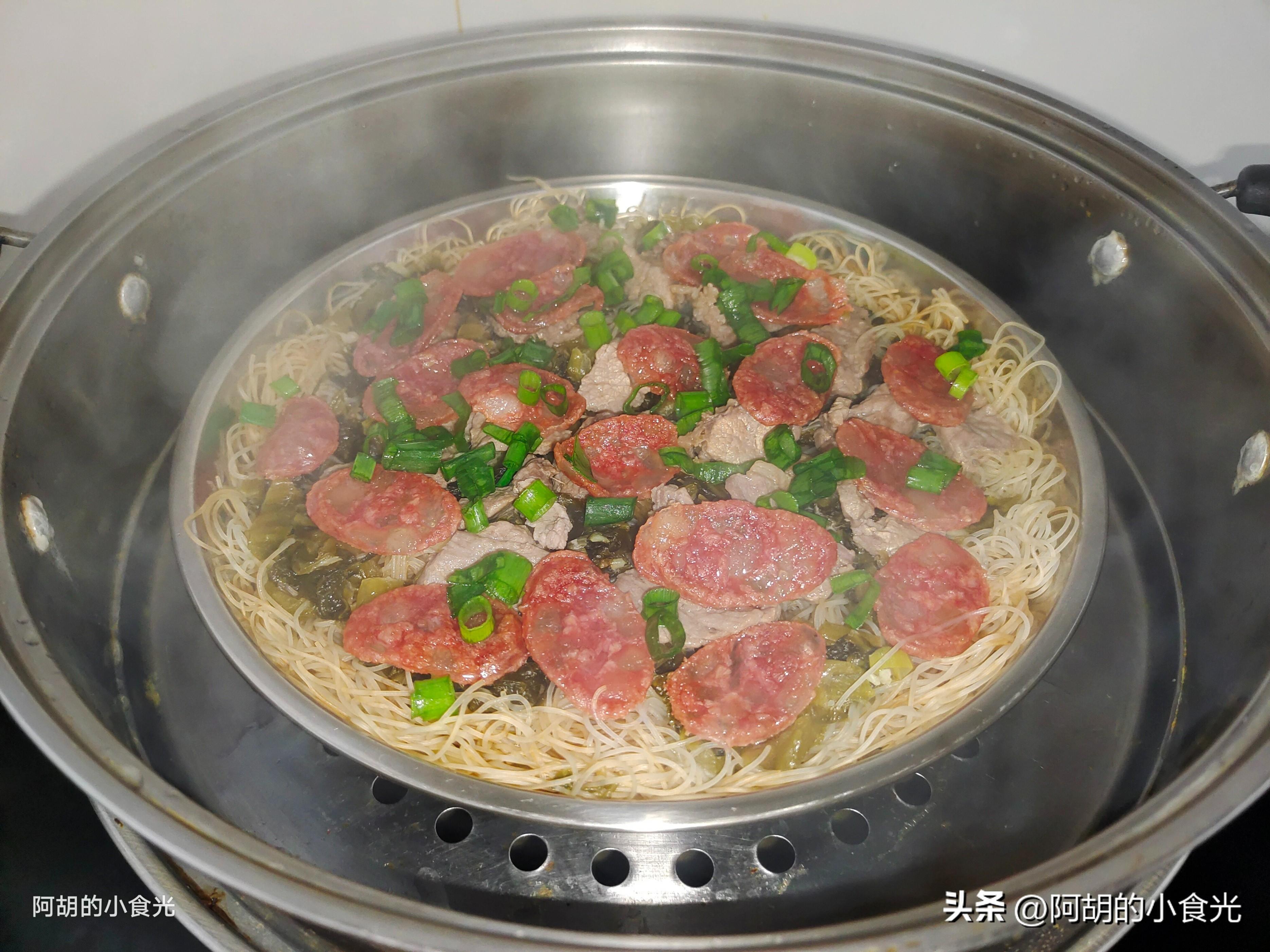 第五步:今天我們開水來蒸,只要提前把蒸鍋裏的水大火燒至沸騰,再把蒸盤上鍋,加蓋後繼續保持大火蒸,計時差不多10分鐘的時間就可以關火了,最後再撒入一把蔥花點綴提味,喫的時候拌一拌就可以了。細粉軟嫩彈牙有口感,就有牛肉的鮮嫩,也有酸菜的開胃和臘腸的鮮甜,味道豐富又開胃,不想炒菜的時候就全家一人蒸一盤,好喫好做又扛餓,感興趣的一定要試一試這個做法。
