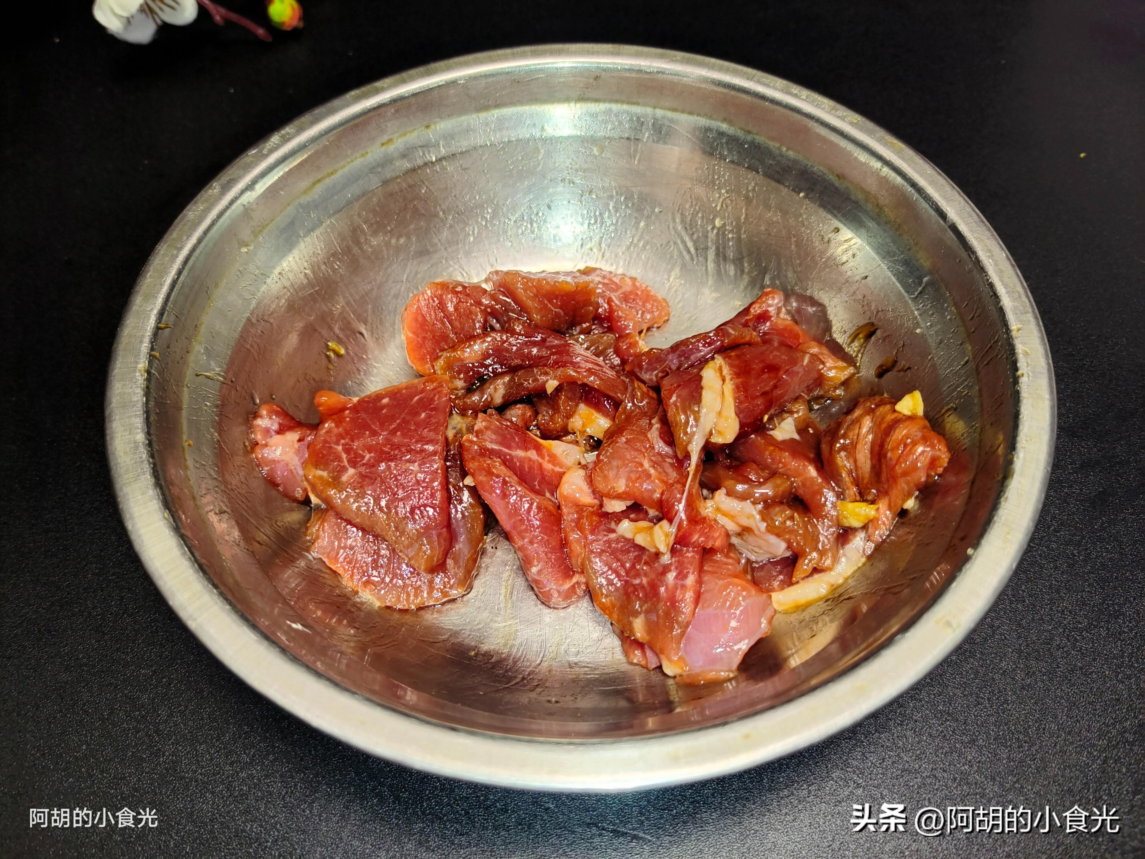 第三步:還有一個最重要的牛肉也要提前醃製一番。一小塊鮮牛肉切片放入碗中,撒入少許的食鹽、生抽、蠔油來抓拌均勻,再來少許的幹澱粉和花生油抓勻待用。