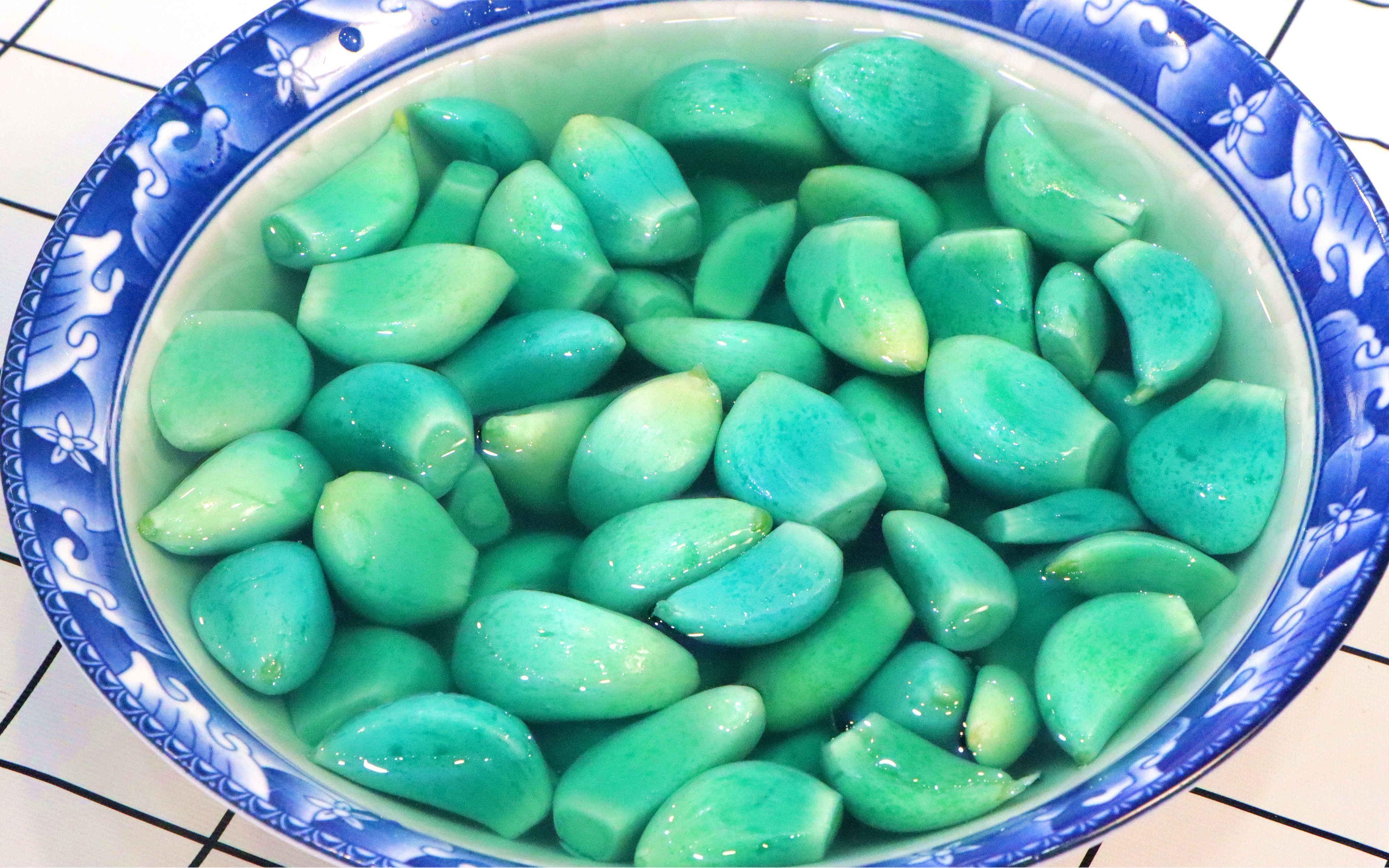 做法很簡單,把蒜瓣去皮後放進密封容器,再倒入適量醋,密封好放到陰涼處,過幾天蒜就會變成綠色。