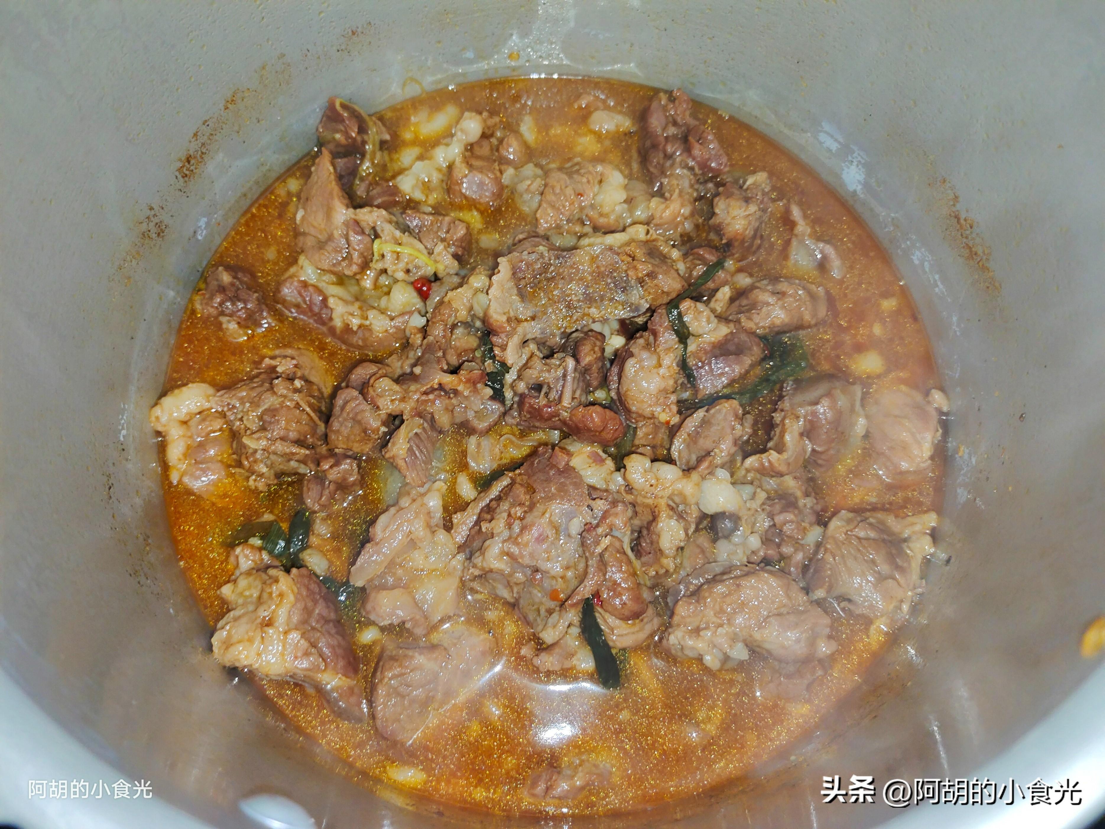 第四步: 準備一些開水直接衝入鍋中,記住此處一定要用開水。此時調味就一次性加足,一些食鹽和雞精即可。而後將肉塊和湯水一塊轉入高壓鍋中,蓋好蓋子後開大火加熱,鍋內上汽後轉爲中小火壓20分鐘就關火。如不用高壓鍋,則這些筋頭巴腦估計得燉煮個一個半小時左右。