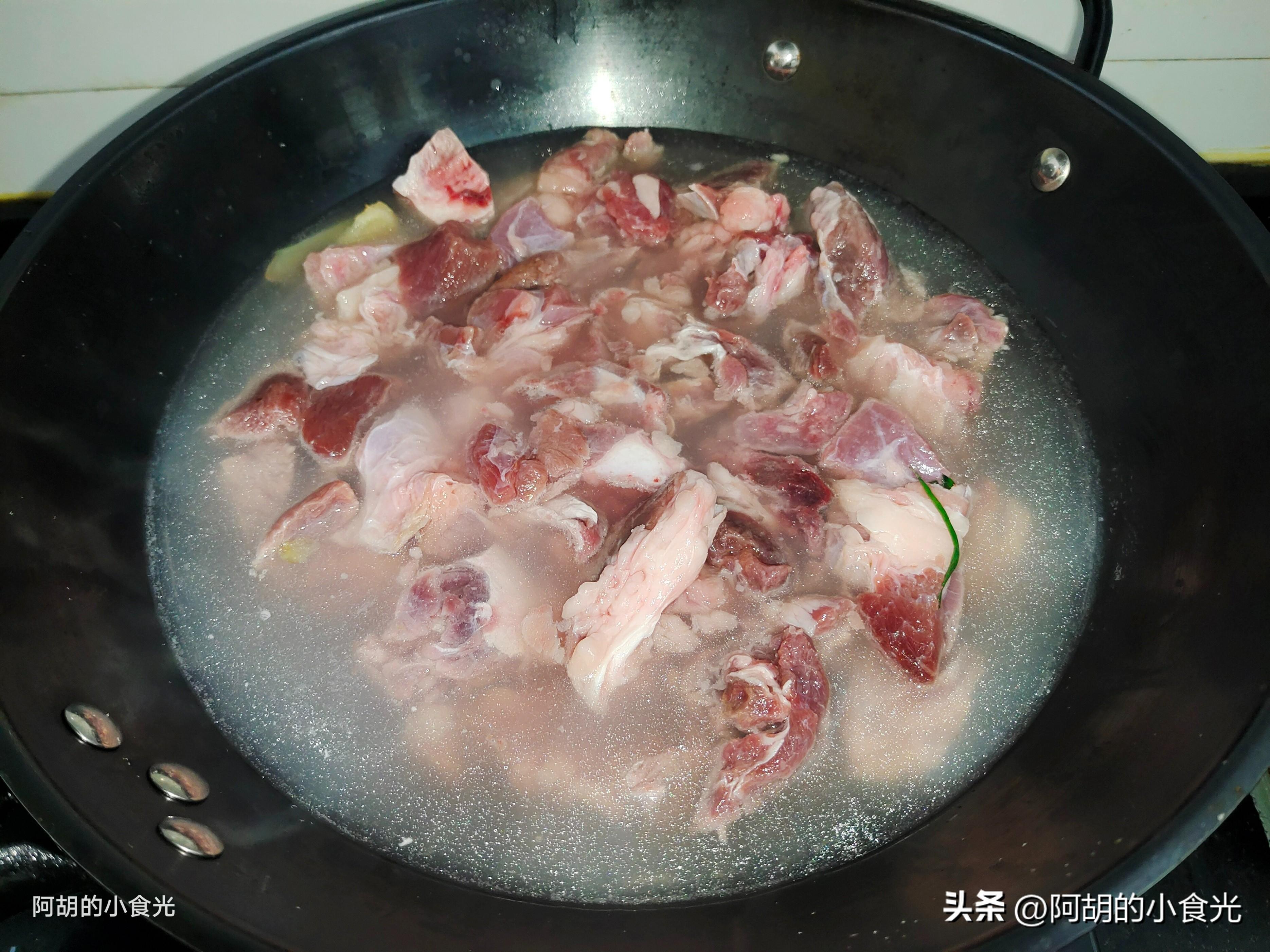 第一步:先來準備今天的筋頭巴腦肉,其實就是一些牛筋、牛肉、牛板筋、牛肚這一類很耐燉煮的肉類,比純牛肉要稍微便宜一些。我們先用涼水把筋頭巴腦浸泡一些時間,幫助泡出一些血水,而後撈出再涼水下鍋加入一些薑片和料酒開大火焯水,保持大火煮個三分鐘左右,而後將肉塊撈出用溫水沖洗乾淨備用。