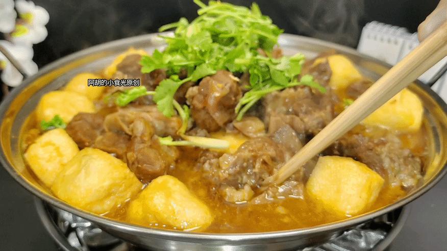 第五步:最後把肉塊連同湯汁一塊蓋在有油豆腐菊花菜的鍋中,是砂鍋的就用竈火加熱至沸騰就可以上桌,是酒精爐的就點燃一塊酒精邊加熱邊喫即可。肉香味濃郁,嫩而不塞牙,尤其是當中牛筋還略帶一些勁道的口感,別忘記底下還有一些蔬菜可以喫,熱乎乎大口吃肉好不痛快,感興趣的一定要試一試這個做法。