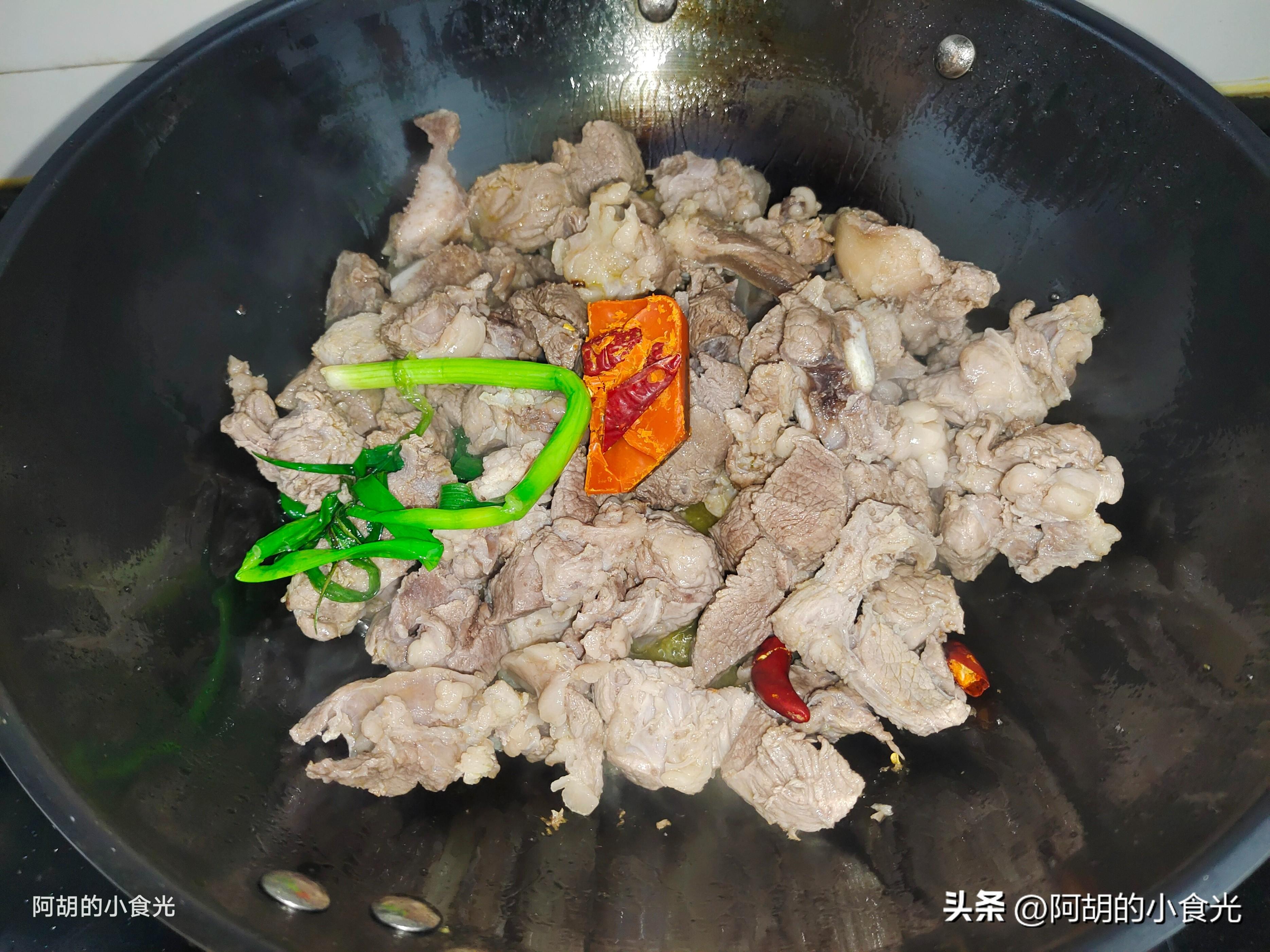 第三步:所有食材備好後就可以開火烹飪了。先小火把炒鍋烘乾,淋入一些菜籽油燒熱,再把蔥薑蒜倒入鍋中煎炒出香味,而後把焯水後的牛肉塊倒入鍋中,加入一塊火鍋底料一塊翻炒均勻,再淋入一些生抽和老抽炒出香味。
