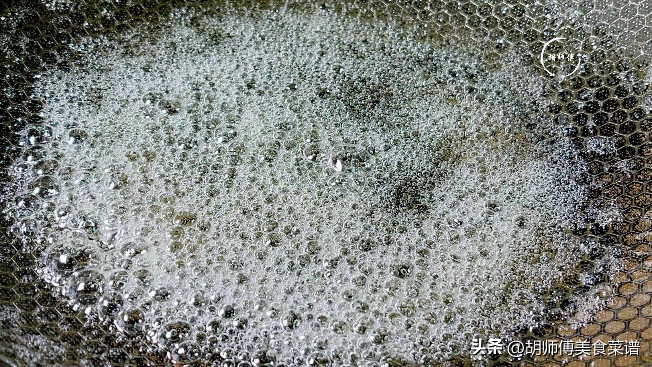 第三步:將半碗水和白砂糖全部都放入鍋中,然後開大火,將糖煮融化後,接着改小火,同時不斷攪拌糖水,直到糖變得比較黏稠,出現大量的大魚眼泡泡,說明糖已經炒好了,此時就可以關火了。