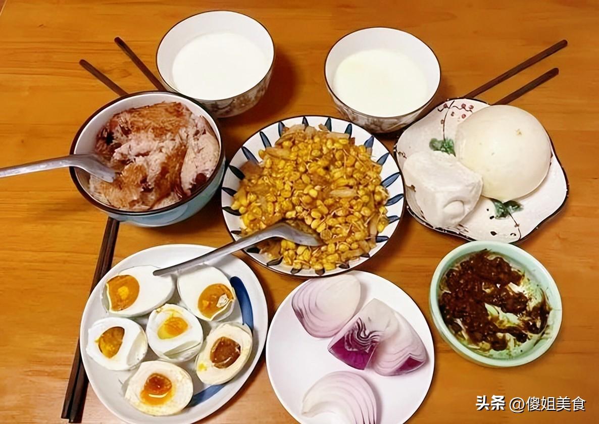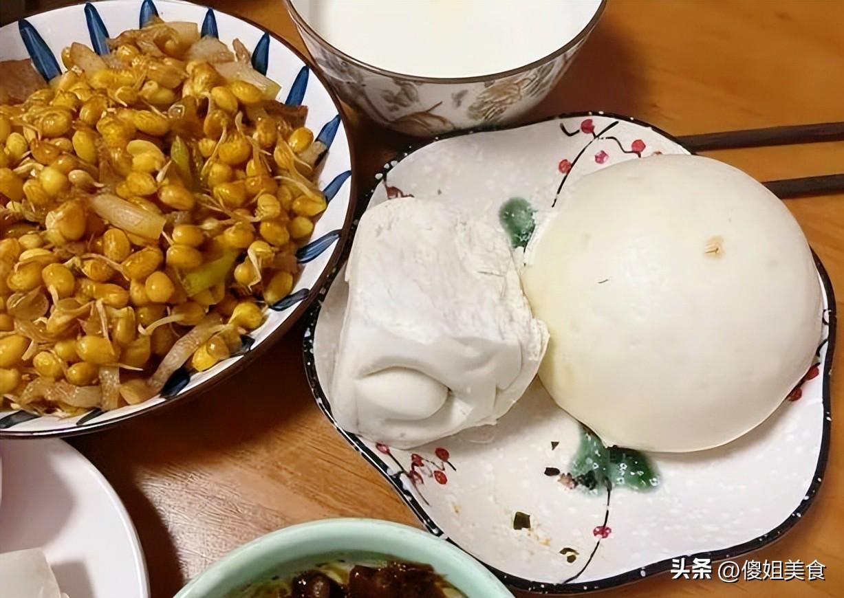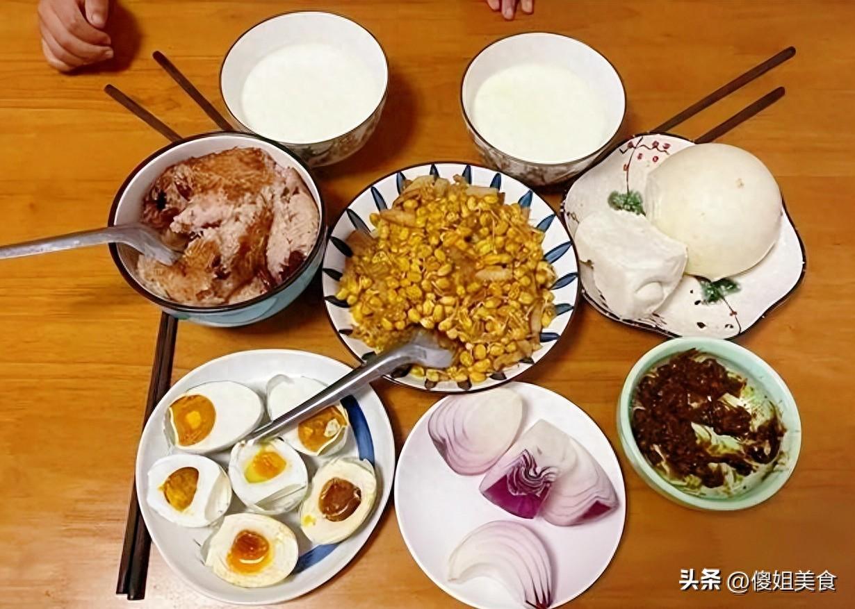 米飯是中午剩下的,放蒸鍋裏簡單一熱就好,饅頭是前天買的,也一起熱了熱。主食嘛,管飽就行。特別要提的是鹹鴨蛋,是我婆婆醃的,個個流油,還不怎麼鹹,特別好喫。知道我從小就愛喫鹹鴨蛋,每年她都會醃上好幾罐,隔段時間就給我們送一些過來,這份心意,比鹹鴨蛋本身更珍貴。兩碗牛奶是給孩子準備的,孩子正在長身體,每天都要喝牛奶,已經養成習慣了。