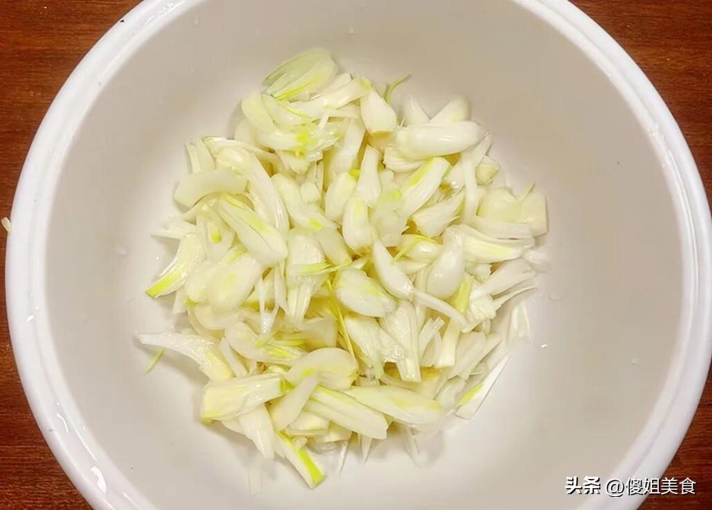 第二步:藠頭可以整個拌,也可以切開。我個人喜歡切片,這樣更容易入味。姜切成細絲,大蒜拍扁後切碎。姜蒜和藠頭是絕配,能激發出彼此最好的味道。