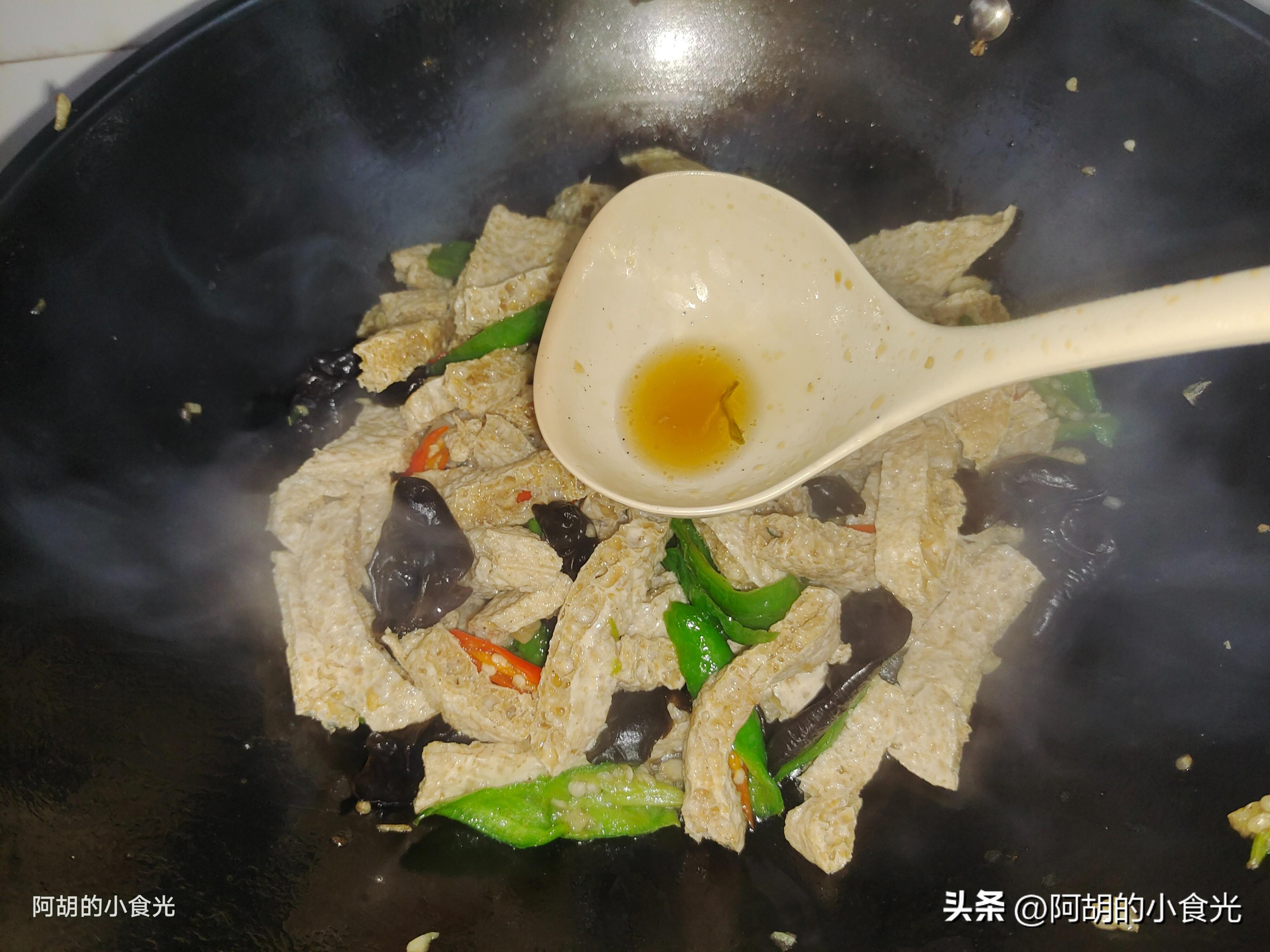 第五步:再將脆豆腐和木耳一塊倒入鍋中,保持大火快速炒勻,而後沿着鍋邊淋入一些生抽和蠔油,也可以再來少許的老抽調整一下顏色,根據口味再撒入一些雞精和少許的食鹽(食鹽也可以不加),而後繼續保持大火炒勻炒透炒出香味。