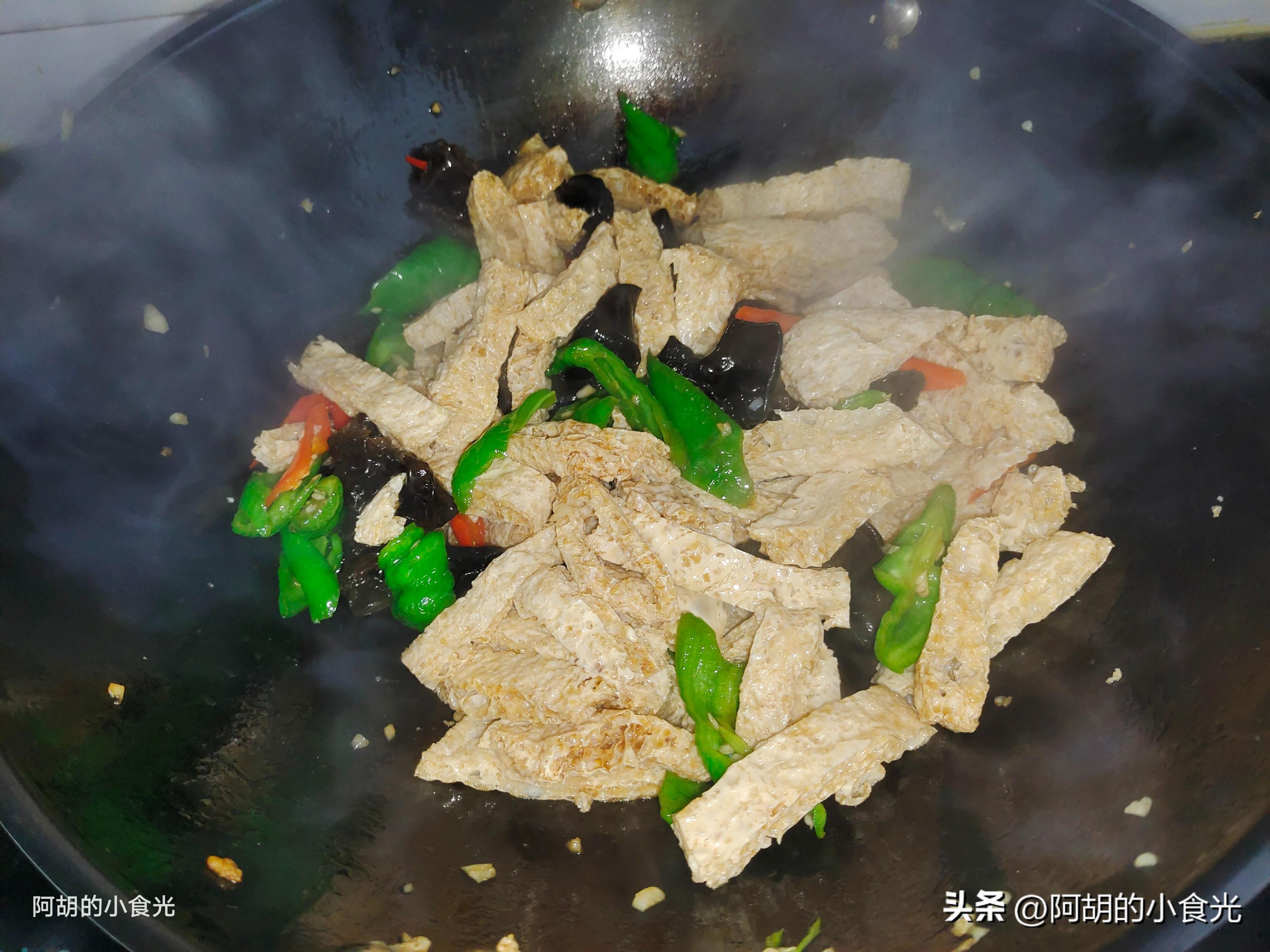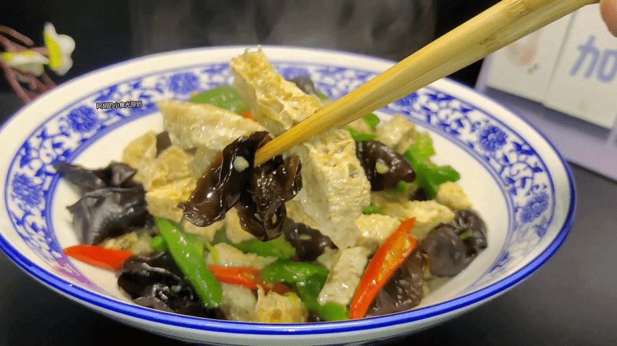 炒的時候別忘記加入一些開水,讓其產生一些湯汁,這樣脆豆腐可以吸收湯汁,喫起來味道更好。