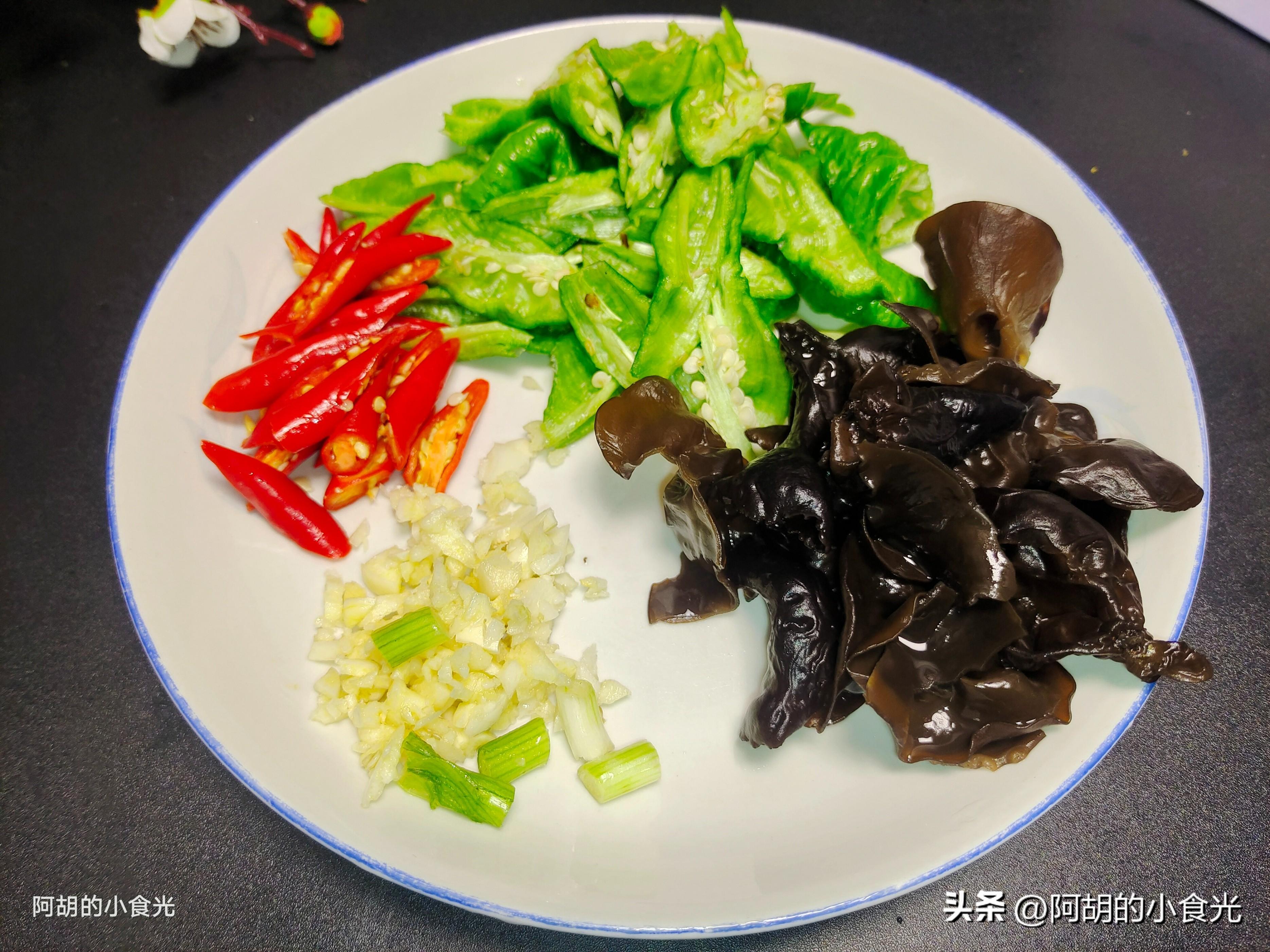 第二步:準備的配菜都比較簡單,有青紅椒適量,這個青椒是螺絲椒切成滾刀塊即可。喜歡辣味的紅椒就用紅小米椒切片,不喜歡的可以改用大紅椒片或者胡蘿蔔片即可,再來少許的幹木耳用溫水充分地泡發後待用。適量的蔥蒜作爲小料待用。