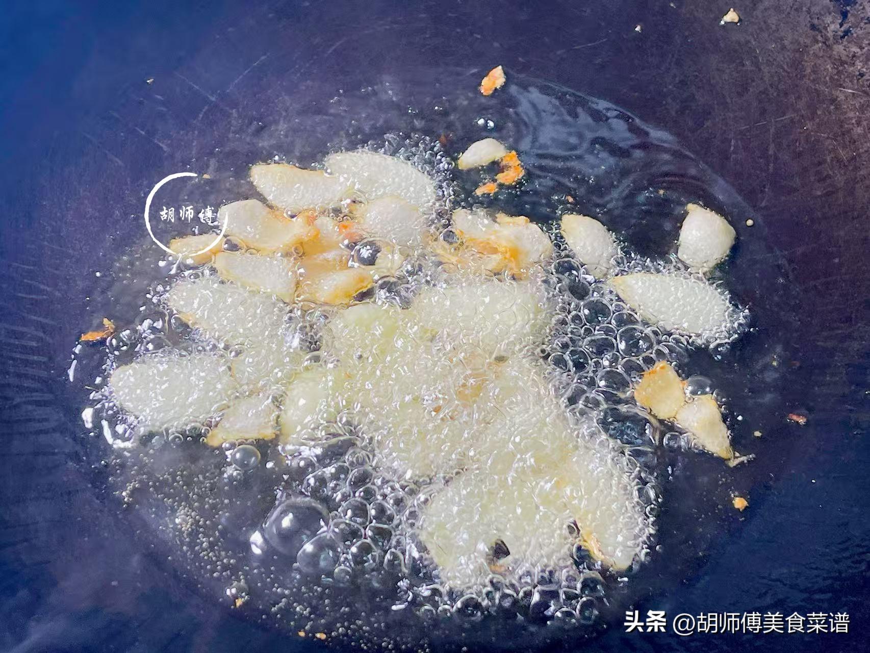 第四步:把切好的肥肉片和少許油,然後開大火,將肥肉炸成金黃色後,再將切好的蒜片放入鍋中炸成淺黃色,這樣可以更好的激發出蒜片的香味。
