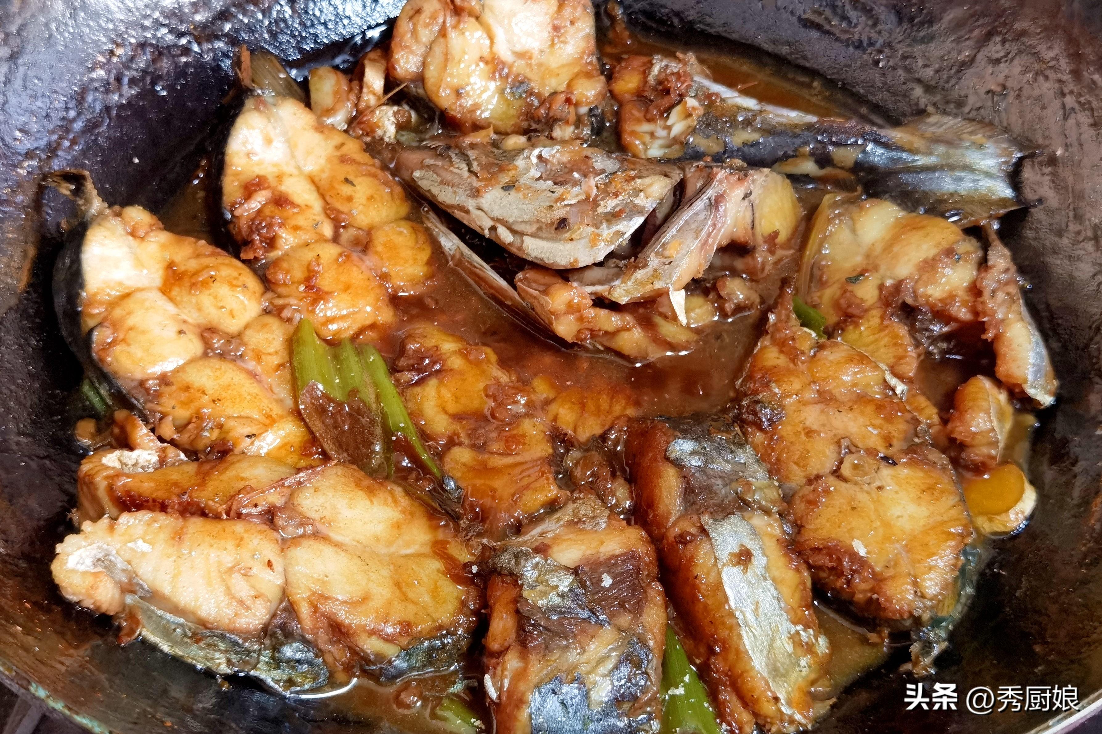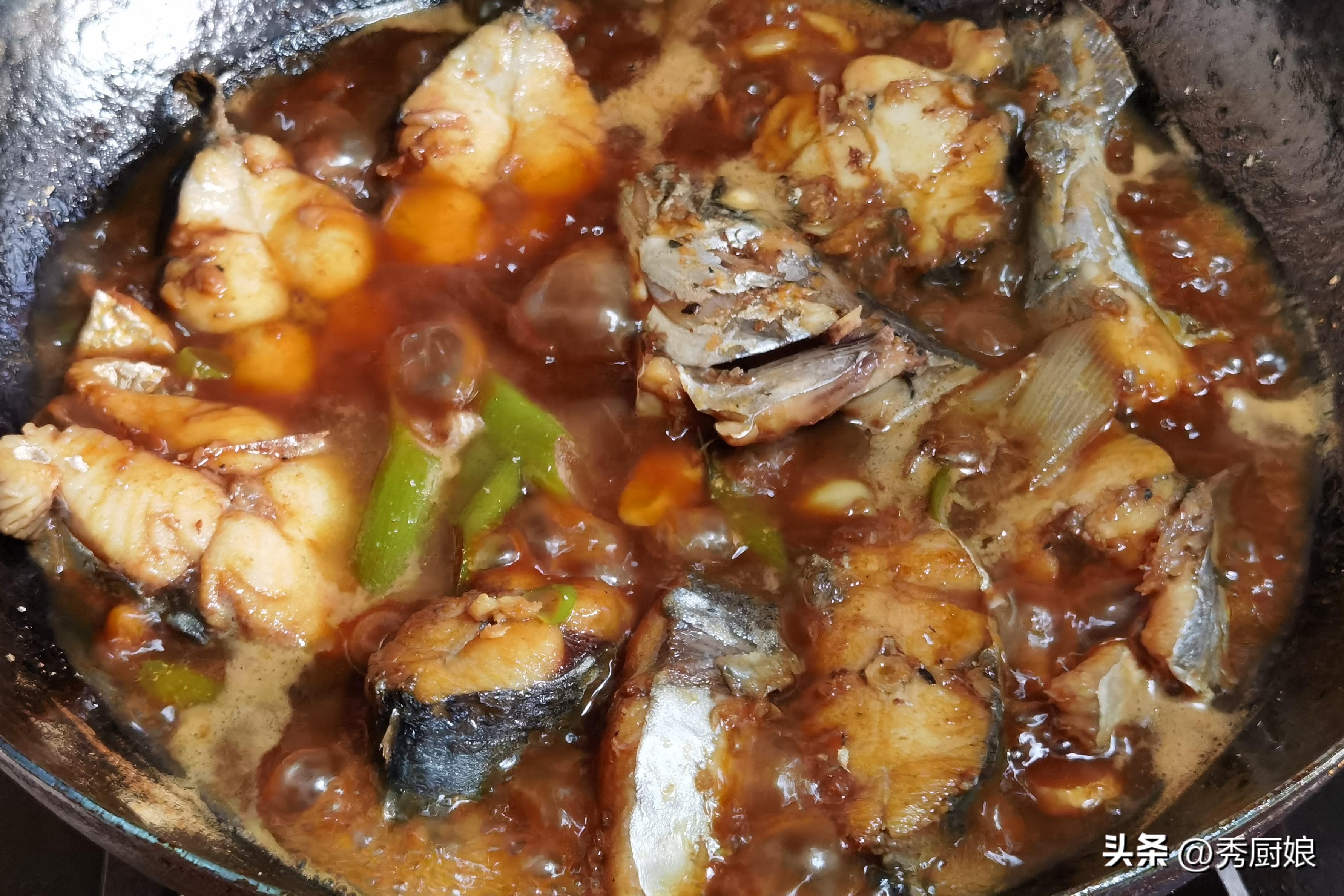 燉個15分鐘左右,打開鍋蓋,用勺子把鍋底的醬汁舀起來,淋在表面的魚塊上,讓它們均勻上色和入味。這時候可以嚐嚐湯汁的鹹淡,根據個人口味決定是否加鹽(一般醬汁的鹹度已經足夠)。