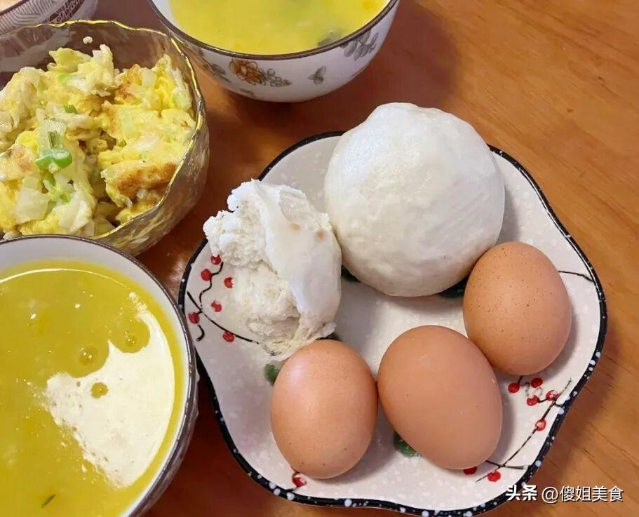 主食是饅頭,婆婆自己蒸的,有嚼勁,面香味很足。水煮蛋一人一個,還有一碗香噴噴的大蔥炒雞蛋。喫完早餐,我又翻了翻朋友圈的評論。有人說“天天喫這些不膩嗎”,有人說“看着就沒胃口”。