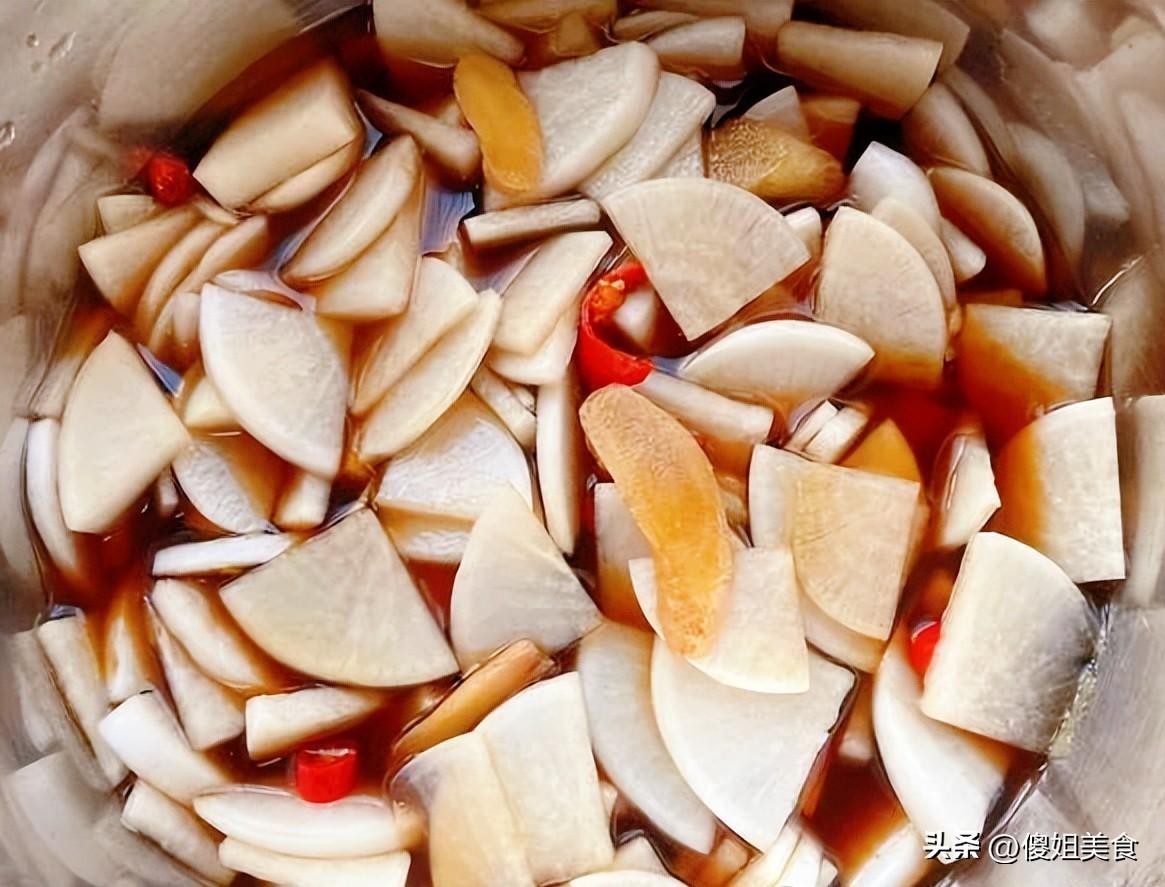 白蘿蔔洗淨,不用去皮,切成薄片,撒上比炒菜多一點的鹽,抓勻,醃半小時把水殺出來。 這時候蘿蔔片變得軟了一些,但還保持着脆度。倒掉醃出來的水,加白糖、白醋、少許生抽,再來點蒜末和幹辣椒段。 最後潑上一勺熱油,香味全被激出來了。拌勻後婆婆會把它裝進玻璃罐裏,“醃一晚上更好喫,不過現在喫也入味了。”