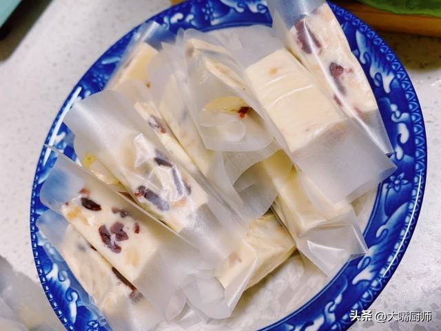取出凝固的牛軋糖,切成小塊即可。牛軋糖口感軟糯,香甜可口,是春節期間深受大家喜愛的糖果。