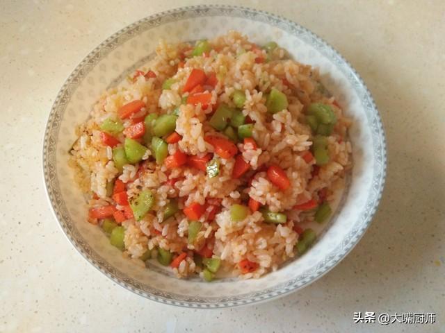 倒入米飯,用鏟子壓散,翻炒均勻。
