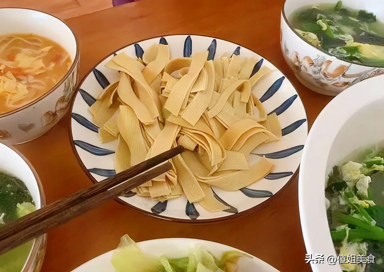 把豆腐皮切成粗細均勻的條,整齊碼在盤子裏,撒上一點鹽,放入蒸鍋蒸七八分鐘關火即可。蒸過的豆腐皮軟嫩滑爽,帶着豆製品特有的清香。喫一口原味的,再嘗一口蘸了湯汁的,簡單的調味反而突出了食材本身的味道。