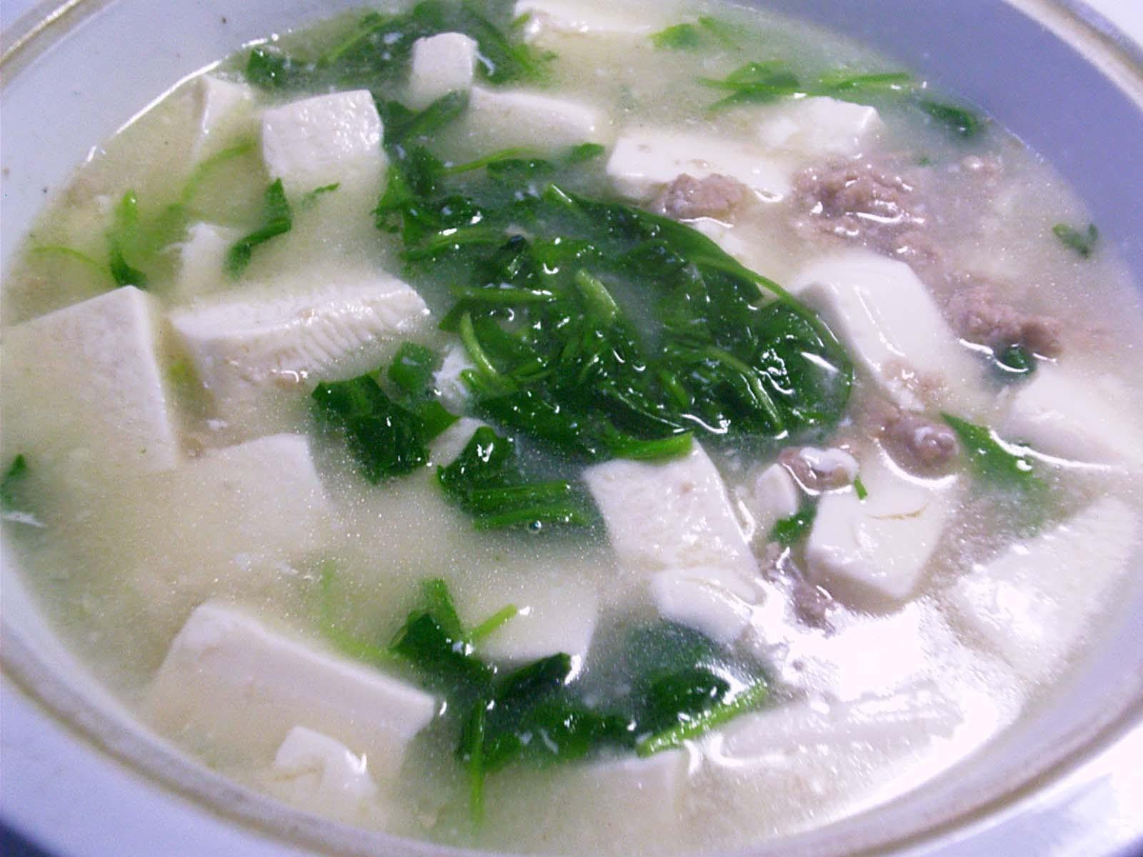 食材:芥菜1把,豆腐1塊, 瘦肉1小塊, 鹽, 胡椒粉,蔥