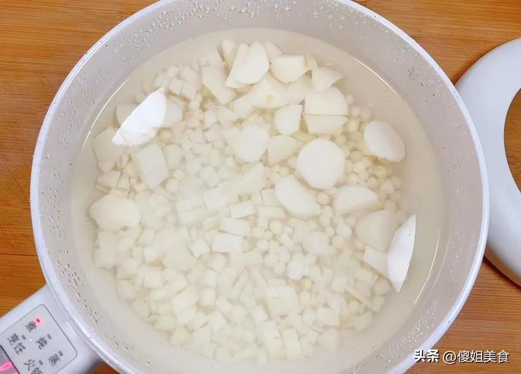 第二步:鍋里加足量水,把泡好的芡實放進去,大火煮開後轉中小火,慢慢熬。大概熬個20分鐘,你會看到芡實開始變得有點透明,這時候把山藥塊放進去,繼續熬15-20分鐘。
