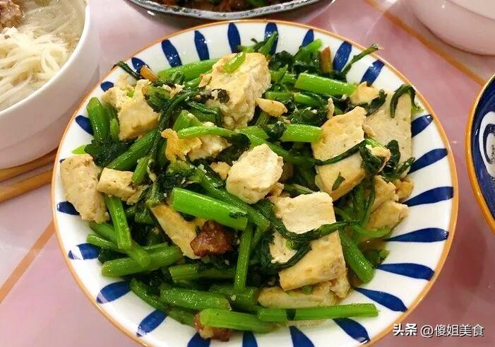 做法簡單得不能再簡單:嫩豆腐切塊,茼蒿洗淨切段。鍋裏少許油,爆香蒜片,加清水燒開,先下豆腐煮兩三分鐘,再放茼蒿。等茼蒿一變軟,加鹽就出鍋。