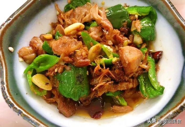 昨晚我們燉了肘子,沒喫完,今天中午,她把肘子肉切小塊兒,又切了個新鮮青椒增色。熱鍋涼油,先下蔥姜煸出焦香,再放肘子肉片和青椒快速翻炒,最後淋一點點生抽,油膩感全無,只剩下滿口焦香。