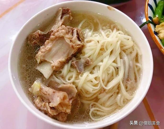 將新鮮肋排清水泡出血水後,直接冷水下鍋,什麼大料都不放,就幾片姜、一段蔥,慢慢撇去浮沫,小火咕嘟了一個半小時。她說這樣燉出來的湯才清亮,肉才原汁原味。麪條是自家麪粉軋的,格外香。