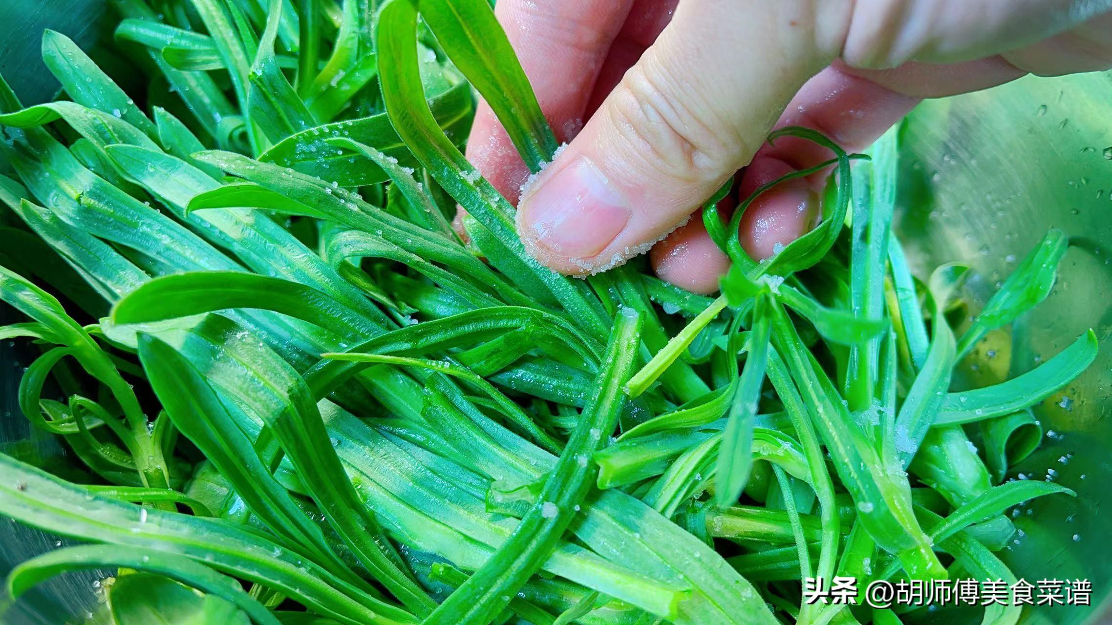 第二步:將麪條菜放入盆中,然後將少許食鹽、雞精、蒜蓉油全部都放入麪條菜中攪拌均勻。
