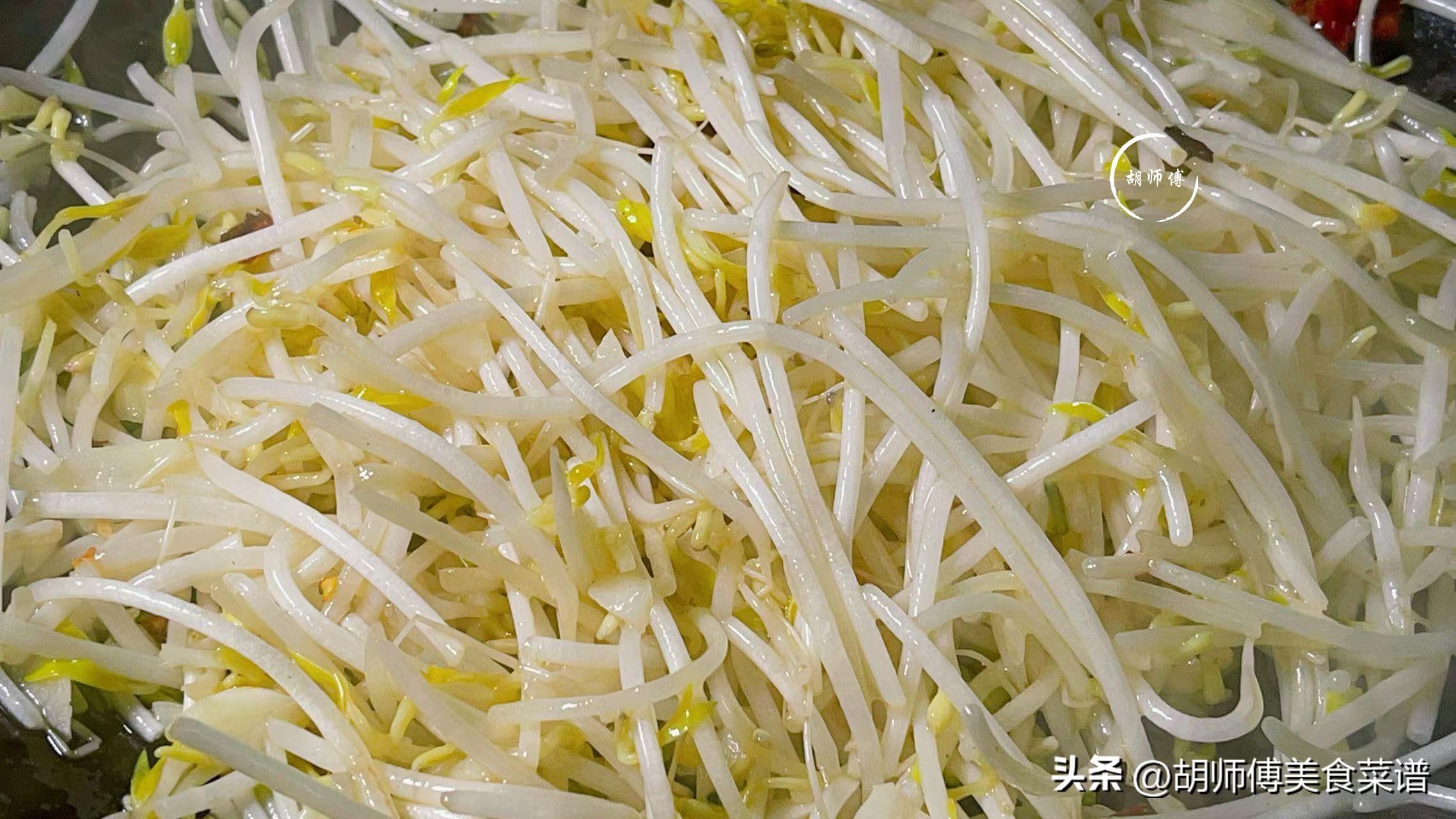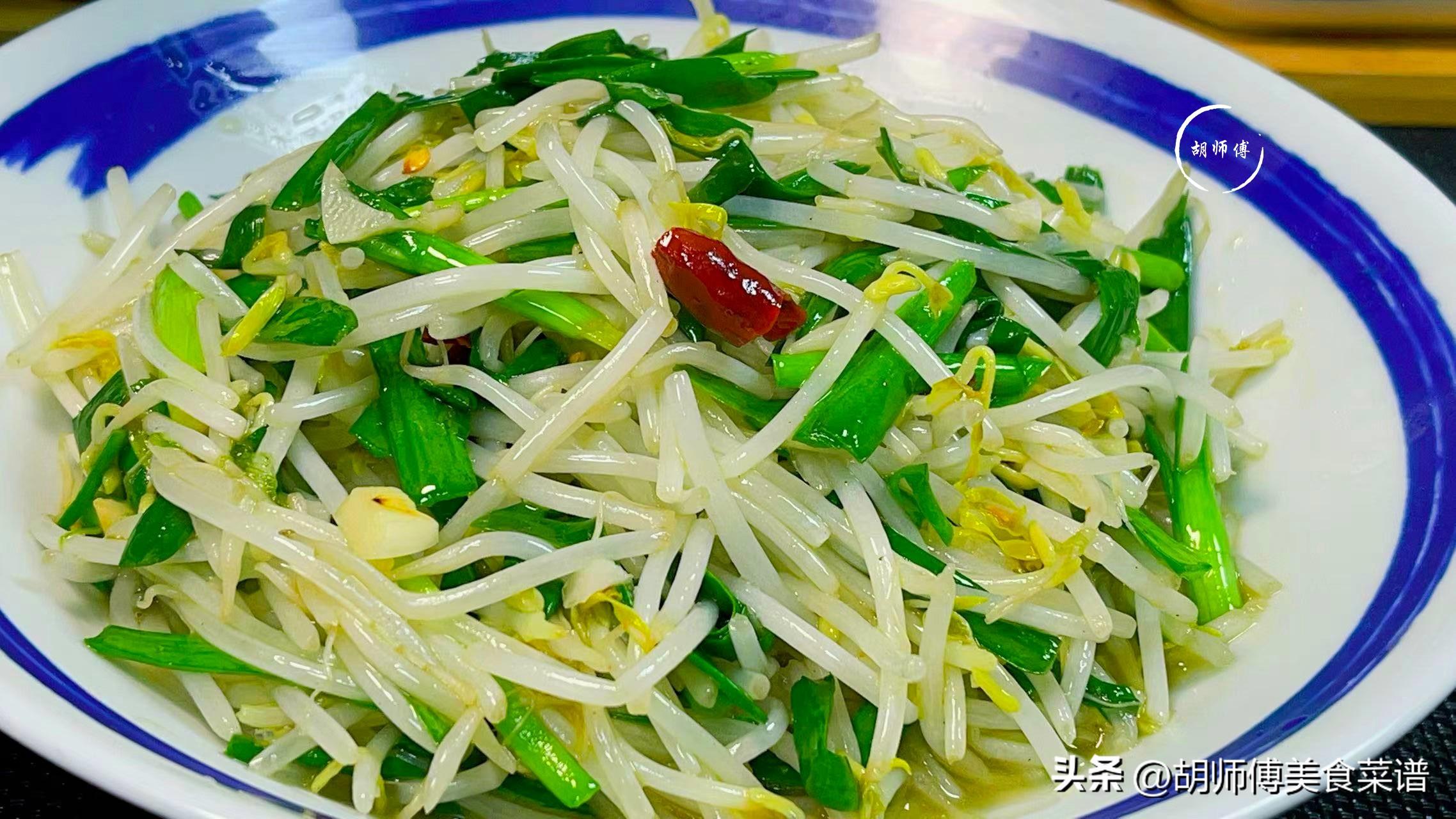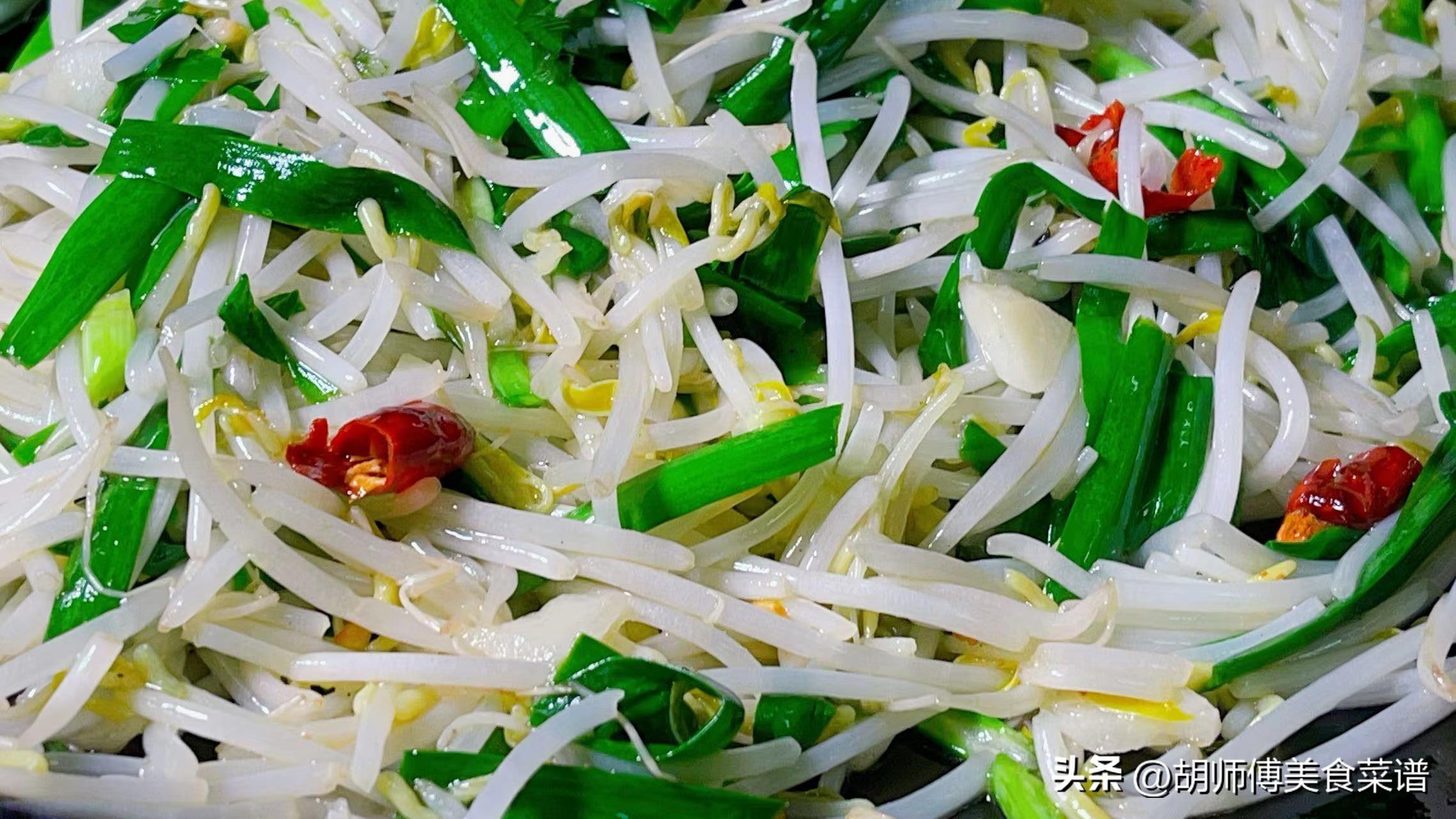 【食材準備】:韭菜200克、綠豆芽200克、幹辣椒、蒜末、食鹽、雞精、豬油適量。