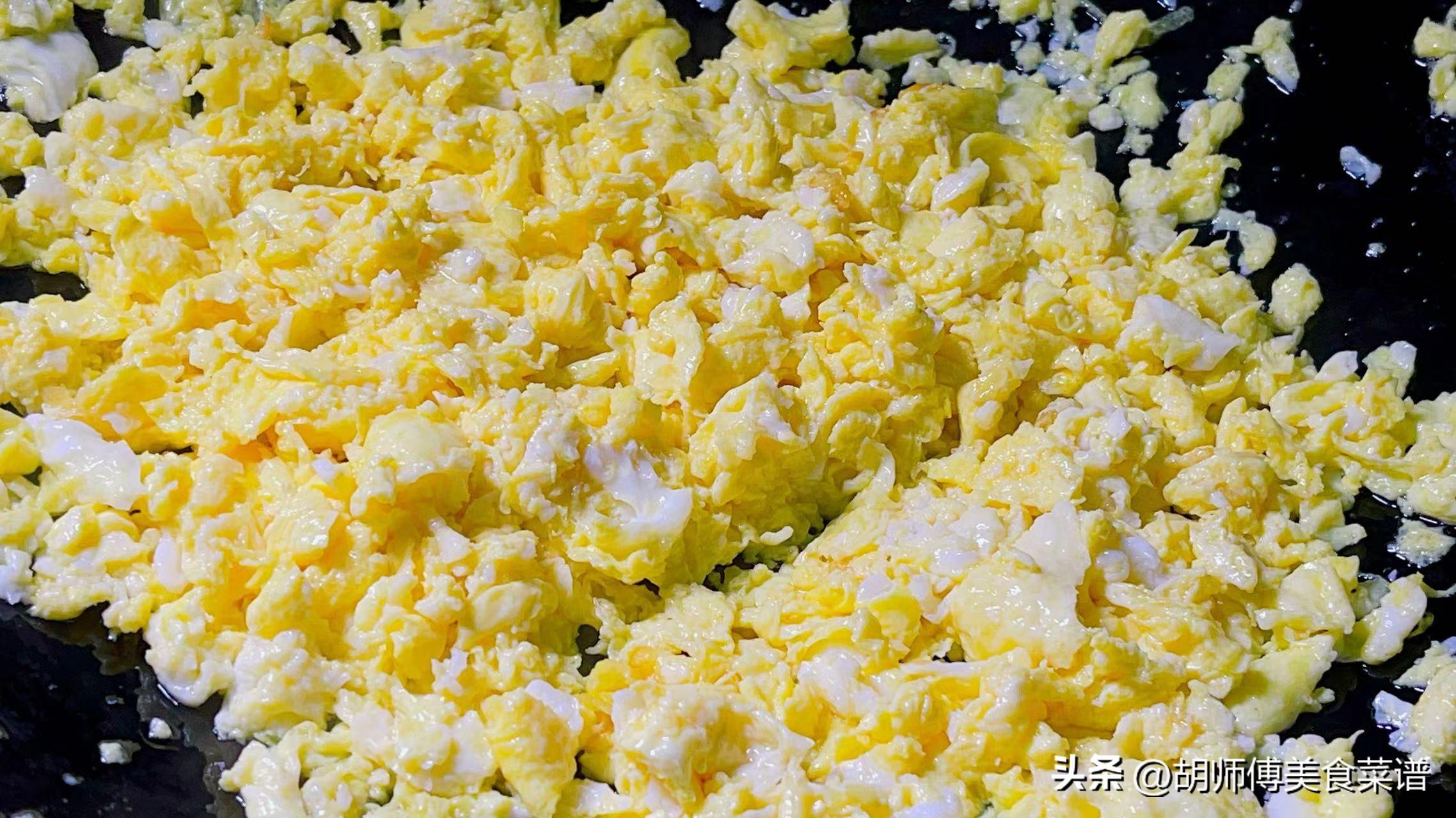 第二步:將紅薯粉泡脹後切成碎末,然後將雞蛋攪拌好後,放入鍋中,將雞蛋炒熟備用。