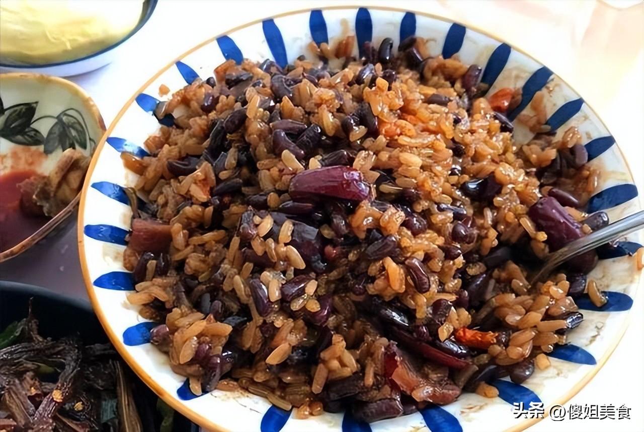 煮出來的米飯紅白相間,糯嘰嘰的帶着豆香,搭配龍蝦尾和鹹菜喫,剛好能中和一下油膩,老人孩子都喜歡。