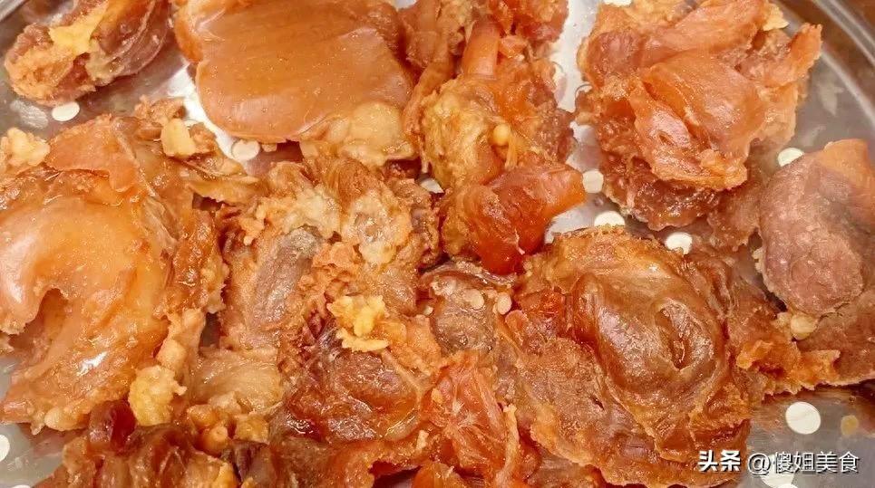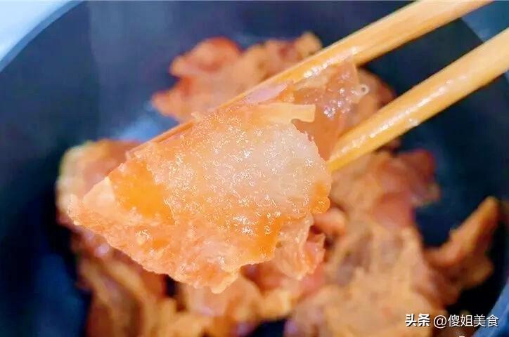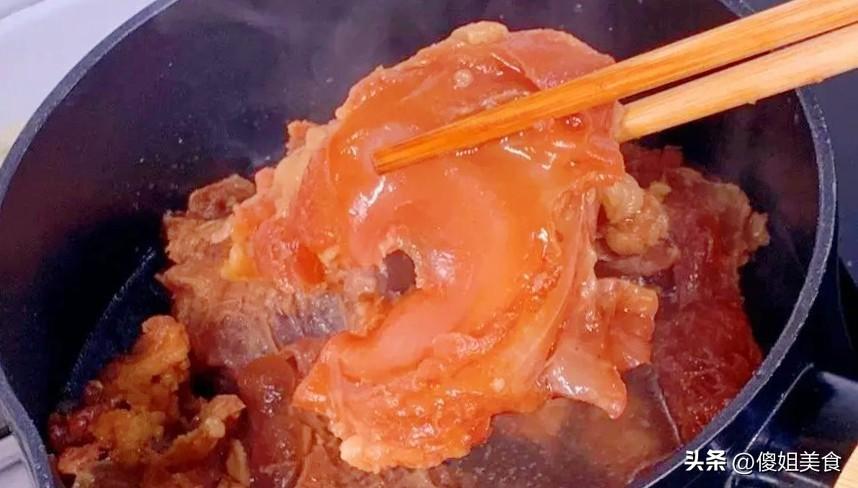 它不像純瘦肉那樣容易柴,也不像肥肉那樣膩,經過耐心的燉煮,它會完成一場華麗的變身。從硬邦邦、韌啾啾,變得晶瑩剔透、軟糯粘脣。用筷子夾起來,顫巍巍,duang duang的;送進嘴裏,不用費勁咬,舌頭一壓,就化開了,但又不是爛糊,還帶着那麼一點恰到好處的彈牙。那種豐腴滑糯的口感,那種濃郁的脂香和膠質融合的滋味,是任何一塊純肉都給不了的滿足感。