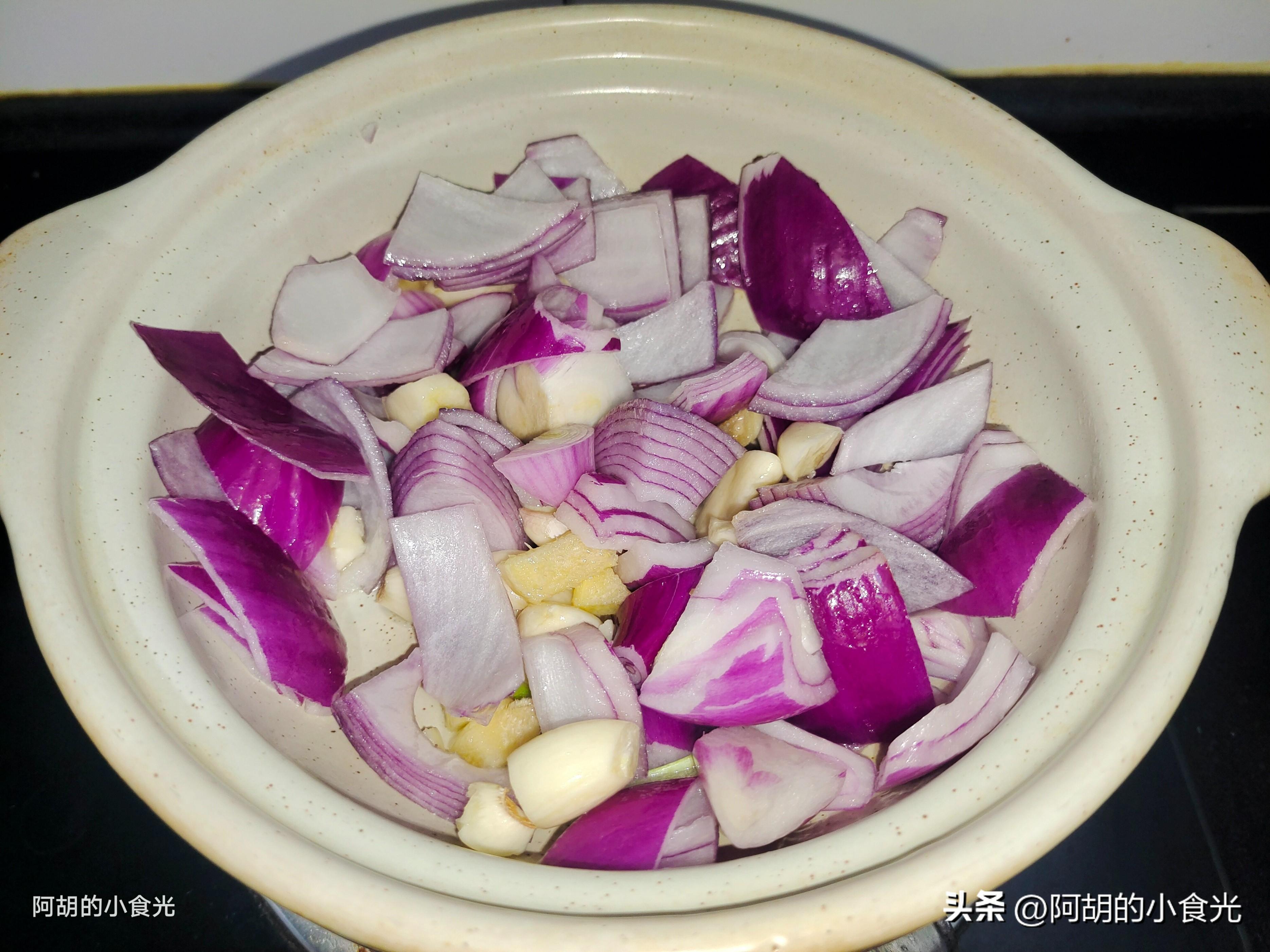 第三步:下面的操作要全部再砂鍋中進行操作,先把砂鍋燒熱,加入一些花生油燒熱,鍵入一些洋蔥塊,大蒜粒和姜粒一塊炒一炒,炒出這些食材的香味,而後取出鹿茸菇鋪在洋蔥的上面。