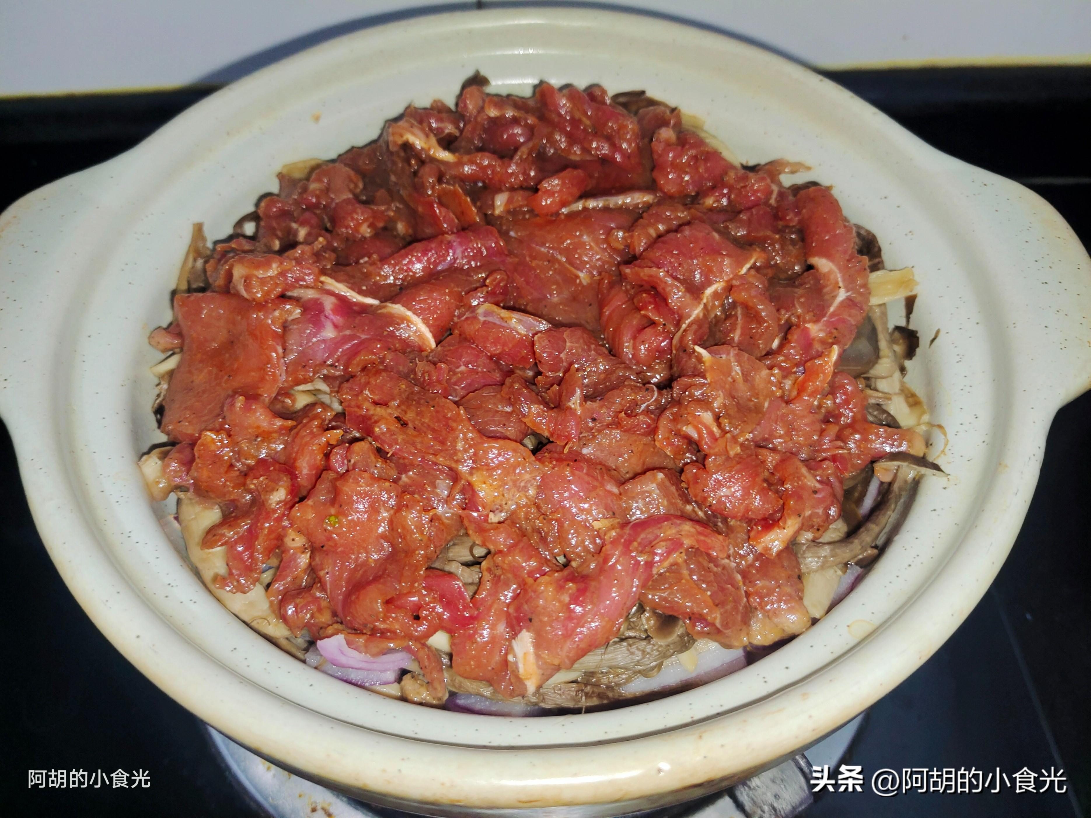 第四步:再把醃製好的牛肉一片一片地鋪在鹿茸菇的上面,整理好後沿着鍋邊淋入一圈開水,而後加蓋保持中小火開始燜煮。