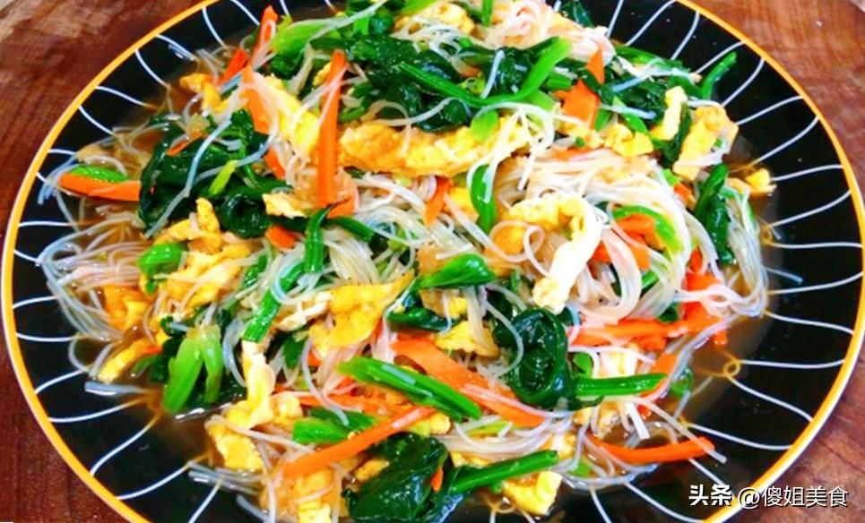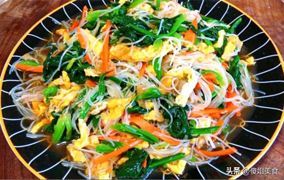 【菠菜拌粉絲】所需食材:菠菜一把(約300克)、粉絲一小捆、胡蘿蔔半根、雞蛋2個、蒜末適量、蠔油、鹽、白糖、米醋、香油、檸檬半個(這個可是祕訣!)