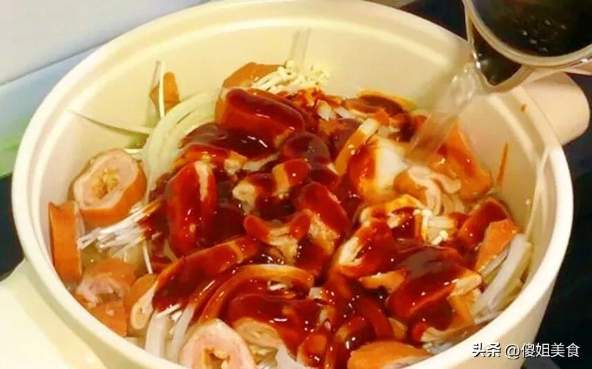 第二步:砂鍋裏放少許油,油熱後放入蔥花爆香,倒入豆腐,翻炒均勻,再把肥腸放進去翻炒均勻,然後鋪上洋蔥,加入麻辣料,倒入足夠的高湯或清水,水量要能沒過所有食材。湯燒開後,加一點生抽調味,少許老抽調色,再來一點點糖提鮮。蓋上鍋蓋,轉中小火,慢慢燉上15-20分鐘。讓豆腐充分吸收湯汁的味道,也讓肥腸更加軟爛。