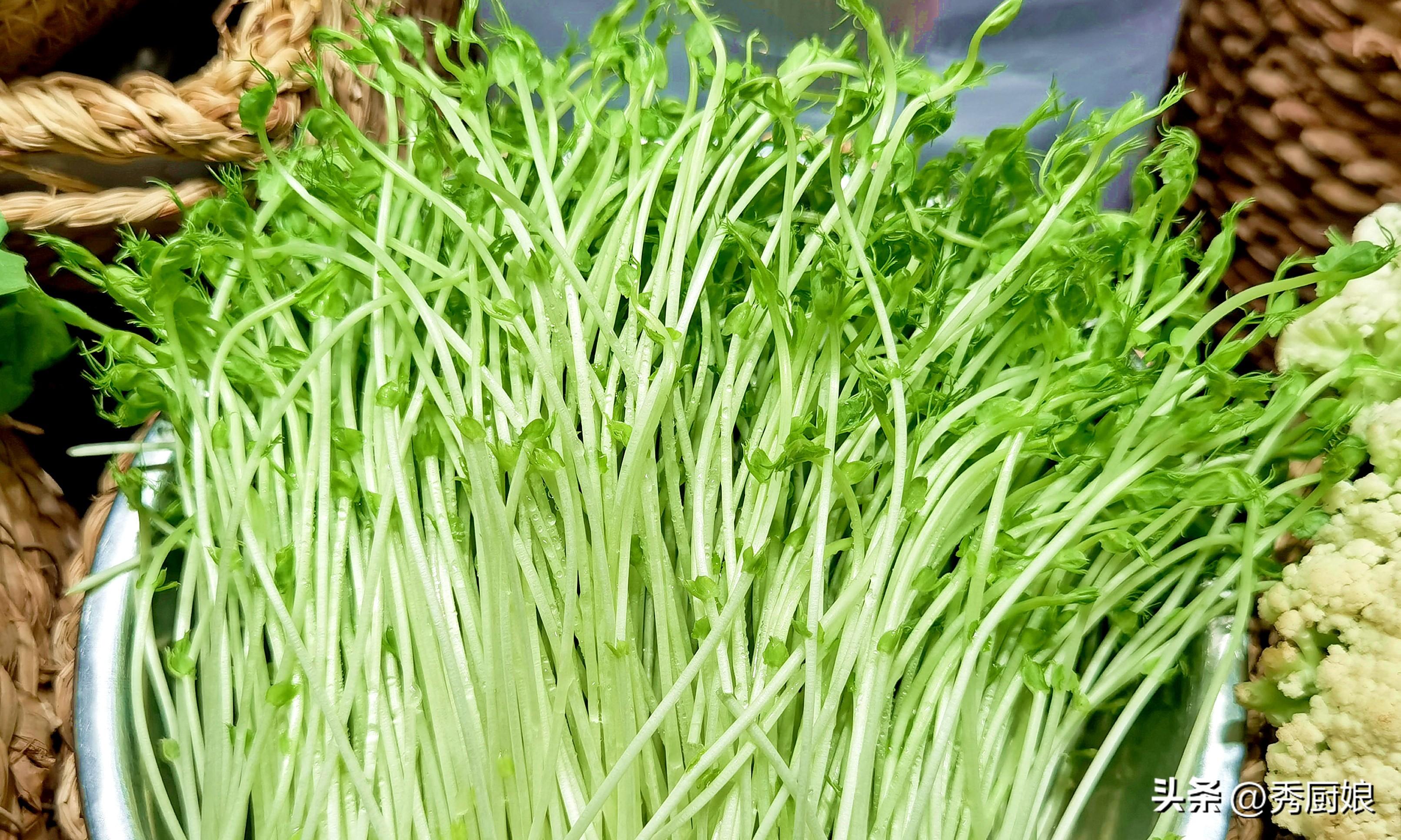 豌豆芽就是豌豆種子發出的嫩苗,水靈靈的,口感特別清脆,帶着豌豆的甜香。它富含維生素C和膳食纖維,能幫助消化,增強免疫力,春天喫它,感覺整個人都清爽了。