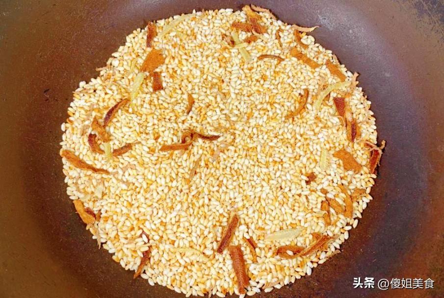 慢慢地,您會聞到米飯的香氣,接着大米的顏色開始變黃,香氣也越來越濃。這個過程大概需要10-15分鐘,一定要有耐心。當大米變成均勻的金黃色時,就可以盛出來了。接着炒薑絲,同樣不用油,小火慢炒。薑絲含水分,一開始可能會有點粘鍋,但炒着炒着,水分蒸發,薑絲會慢慢變幹、變捲曲。當薑絲變得乾爽,邊緣有點焦黃時,就炒好了。最後把陳皮絲也放進鍋裏,小火翻炒一兩分鐘,把陳皮的香氣激發出來。