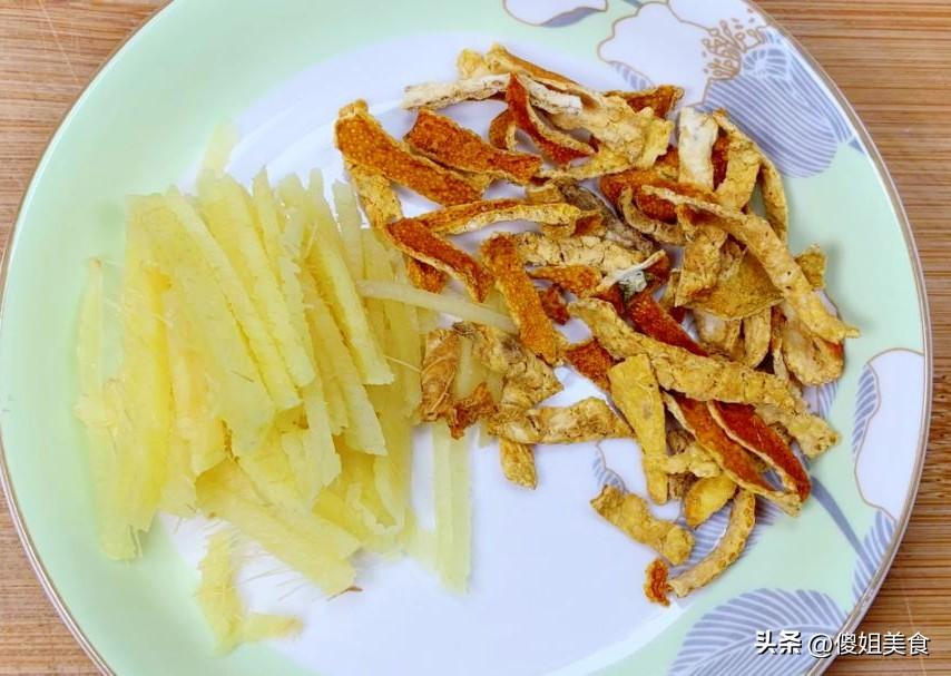 做法步驟:第一步:生薑洗乾淨後,切成細絲。切薑絲有個小技巧,先切成薄片,再疊起來切絲,這樣又快又均勻。陳皮用清水稍微泡軟,然後也用剪刀剪成細絲或者小塊。如果陳皮很乾淨,不泡也行。大米淘洗一兩遍,然後瀝乾水分。最好能提前半小時洗好,攤開晾一晾,這樣炒的時候不容易粘鍋。