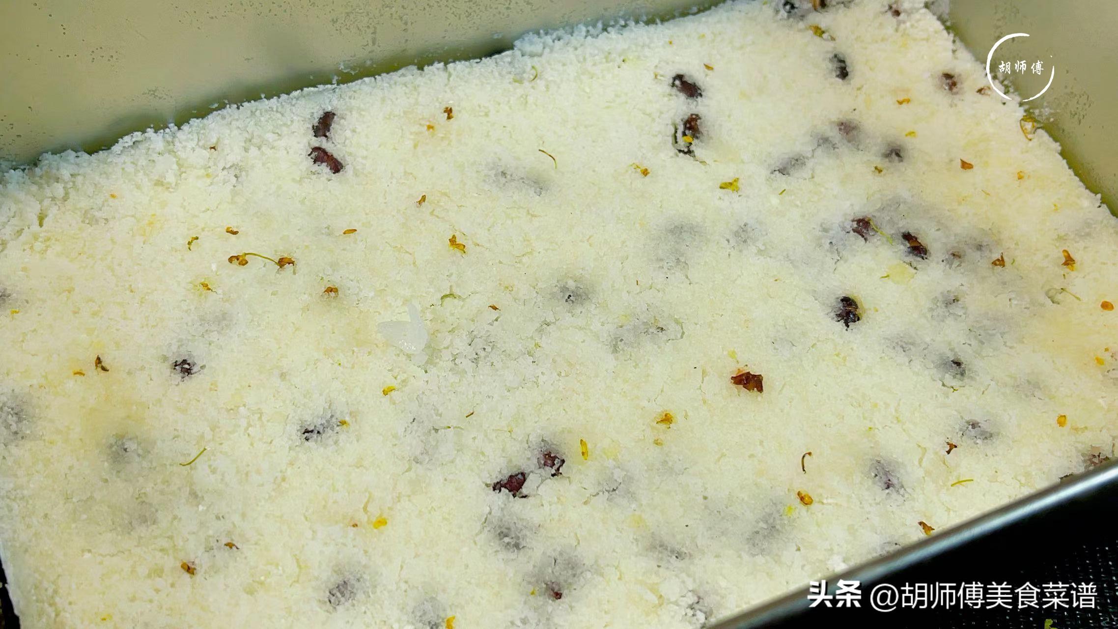 第四步:準備一個乾淨的碗,將蒸好的一半雞頭米大米粉放入碗中,然後鋪上一層紅豆,接着再把另一半雞頭米大米粉放入碗中,最後將它們按壓緊實放入蒸鍋蒸20分鐘,時間到後,把雞頭米糕倒扣出來,切成大小適中的塊狀即可食用(喜歡喫桂花的,可以撒上一點點桂花)。