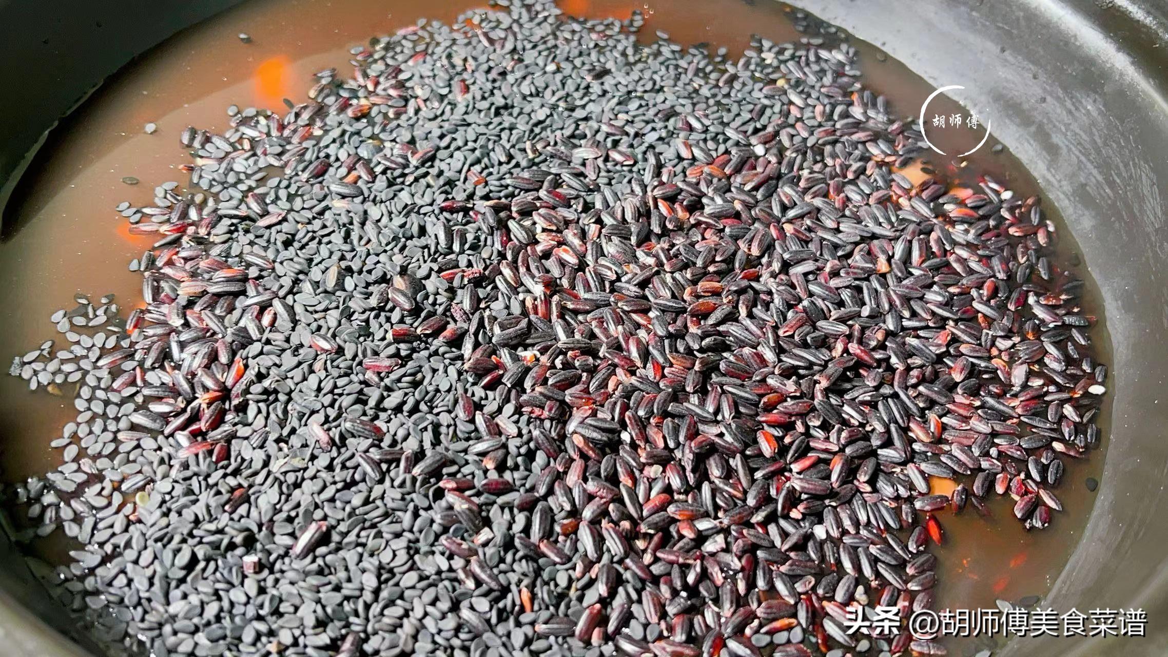 【食材準備】:黑米100克、黑豆80克、黑芝麻20克、冰糖適量。