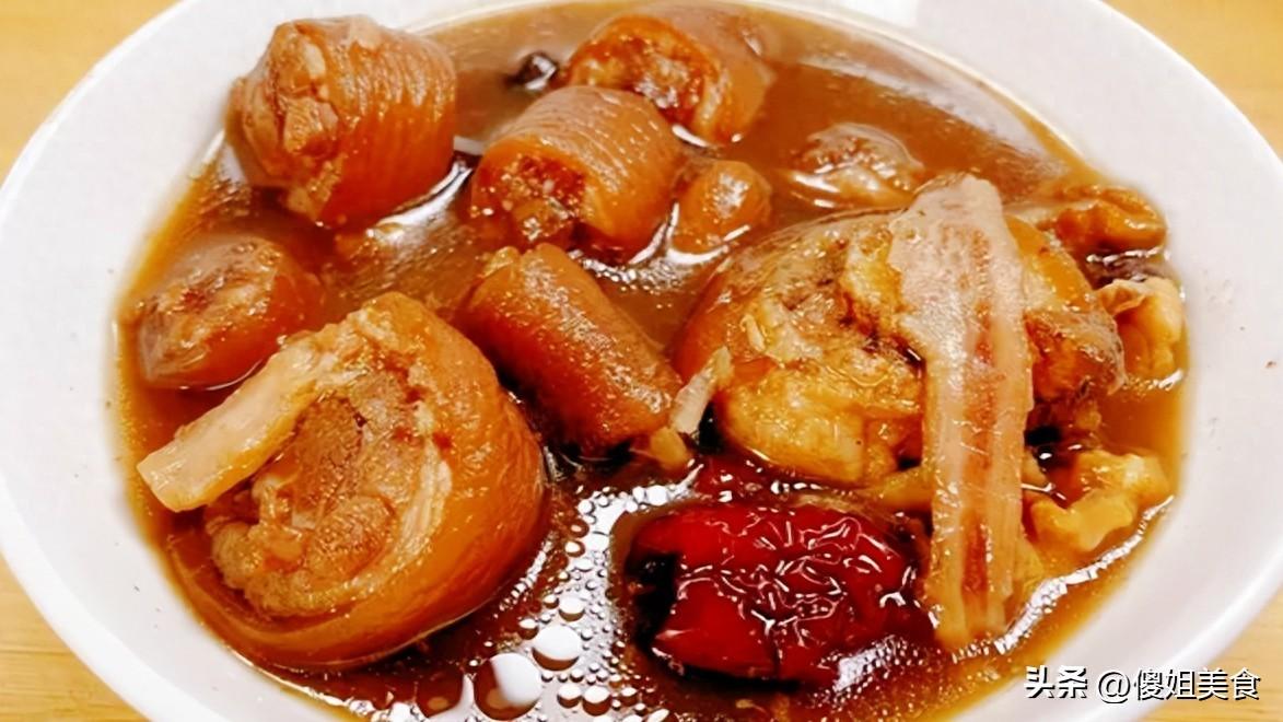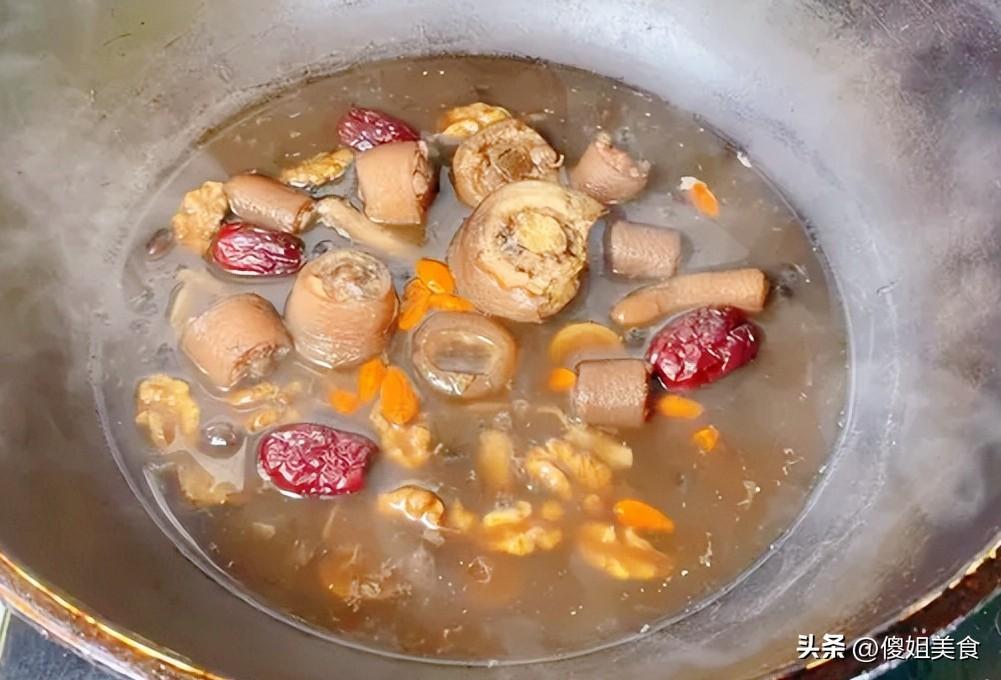 第二步,把處理好的豬尾巴、黑豆、紅棗、核桃仁、白芷、當歸一起倒入鍋中,加入足量的清水,一定要一次加夠,中途最好不要加水,不然湯的味道會打折扣。大火燒開後,轉小火慢燉。我一般會燉上2個小時左右,讓所有食材的味道充分融合。家裏有電燉鍋的就更方便了,定好時間就不用管了。