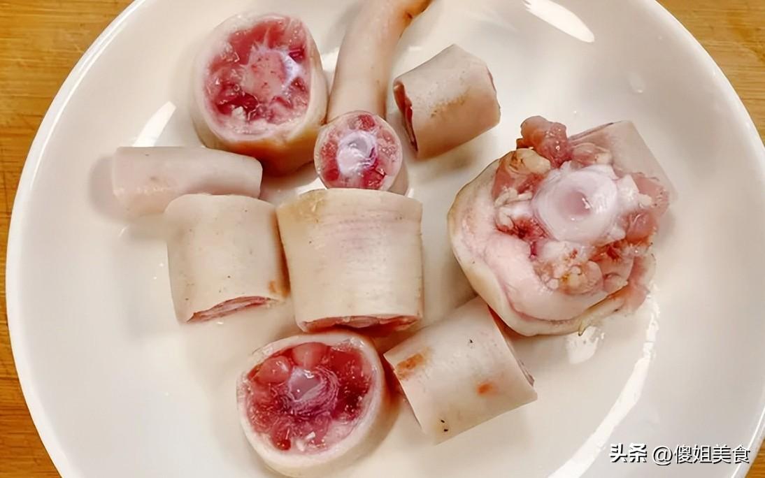 詳細做法:第一步,先把豬尾巴處理乾淨,然後剁成小段,冷水下鍋,加幾片姜、一點料酒,大火煮開焯一下水,去掉血沫和腥味。焯好水的豬尾巴撈出來,用溫水沖洗乾淨,切成小段。黑豆提前用清水浸泡2-3個小時。泡過的豆子更容易煮爛,湯色也更醇厚。
