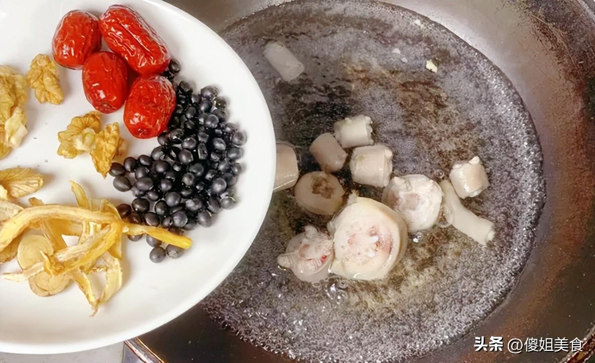 【豬尾巴黑豆湯】準備食材:豬尾巴、黑豆、紅棗6-8顆、核桃仁一把、白芷2-3片、當歸一小段(不喜歡藥味的可以少放點)、枸杞一小撮、鹽適量