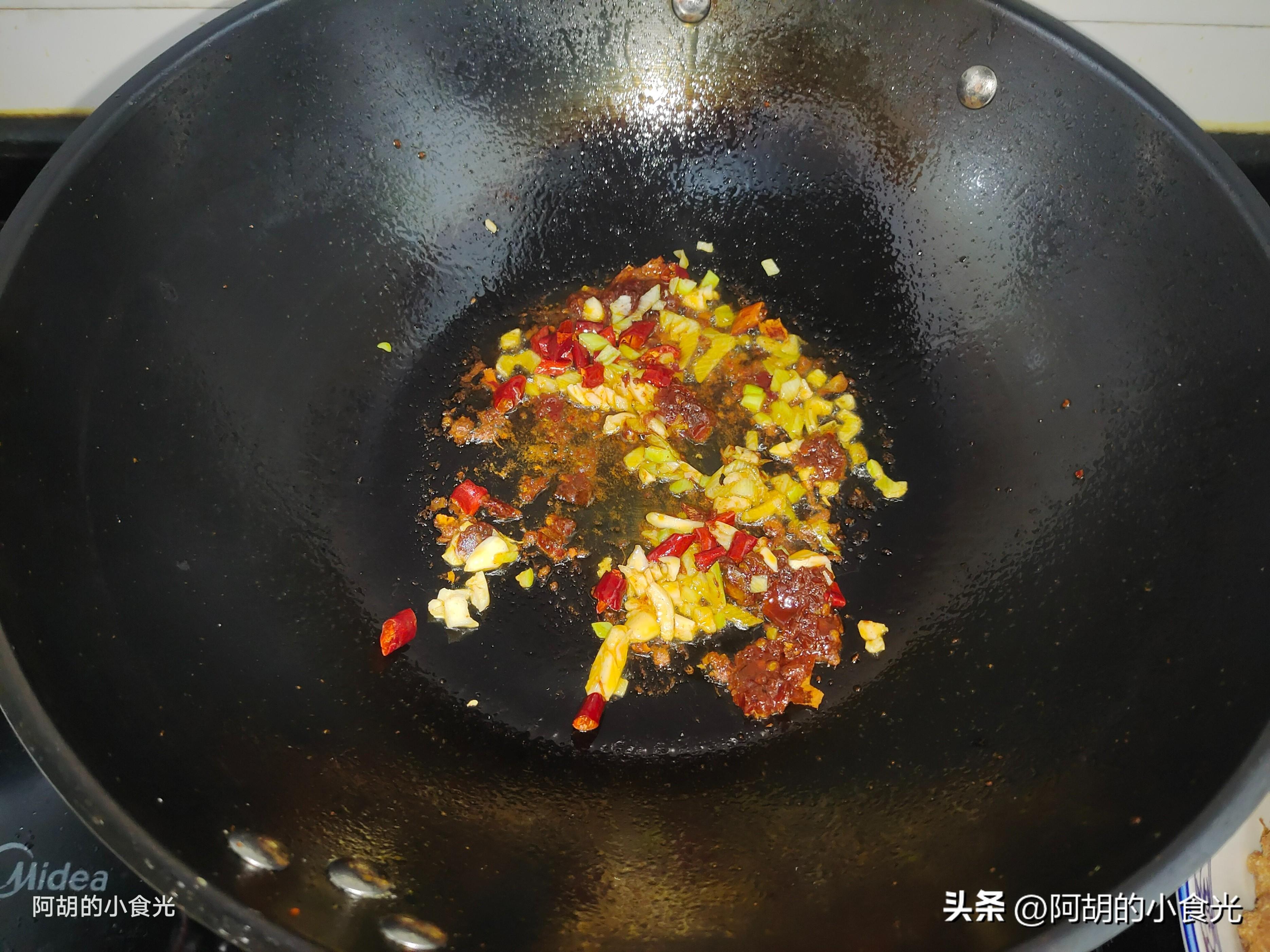 第四步:起鍋燒一些食用油,把郫縣豆瓣醬和蔥蒜幹辣椒一塊下鍋炒一炒,炒出豆瓣醬和小料的香味,再淋入一些生抽熗出香味,接着往鍋中直接衝入開水適量,轉爲最大火將其煮開煮沸。