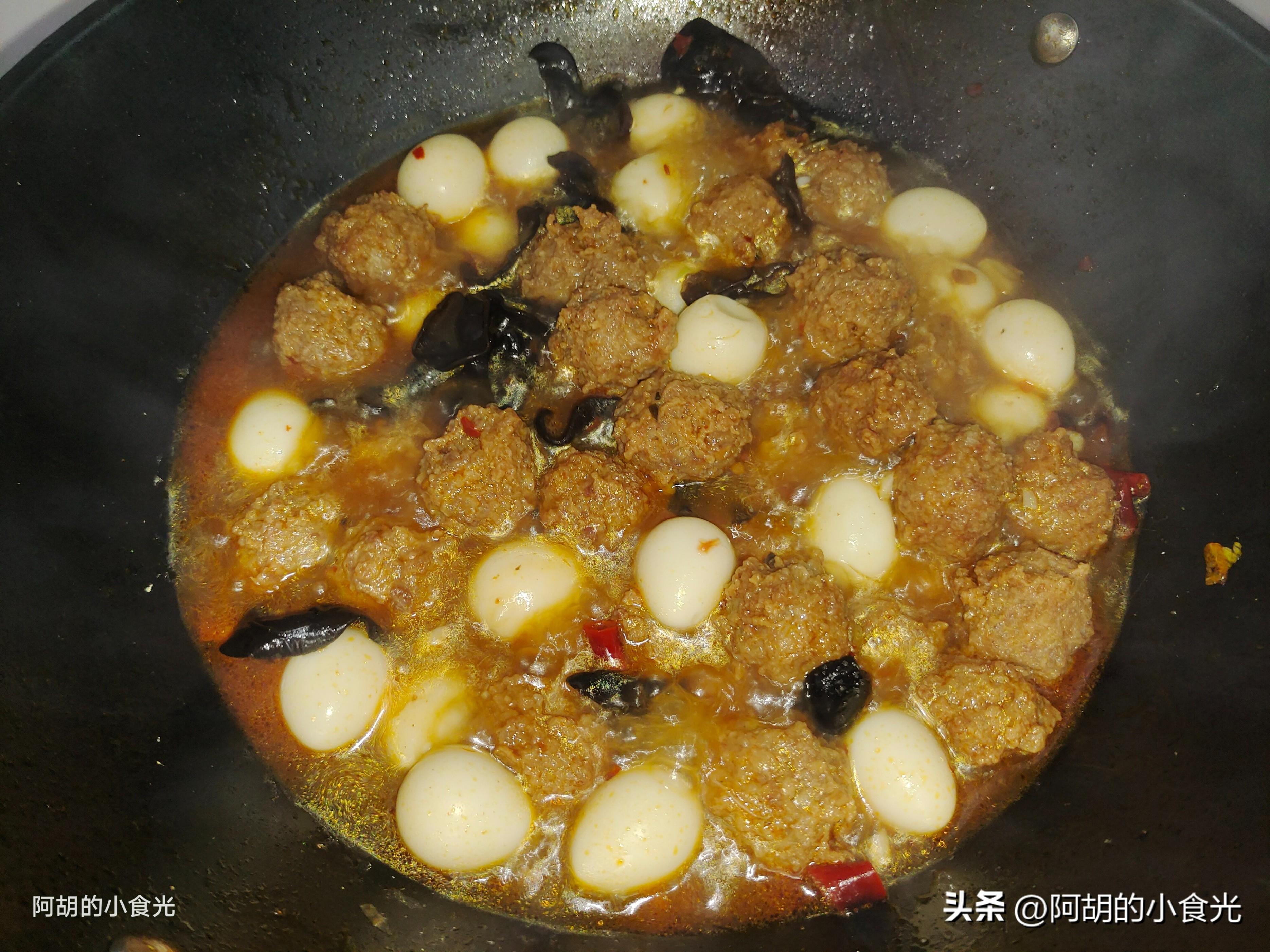 第五步:把炸丸子、鵪鶉蛋和木耳一塊倒入鍋中,調味就少來一些食鹽、胡椒粉和雞精,就這樣保持大火燒個五六分鐘左右。